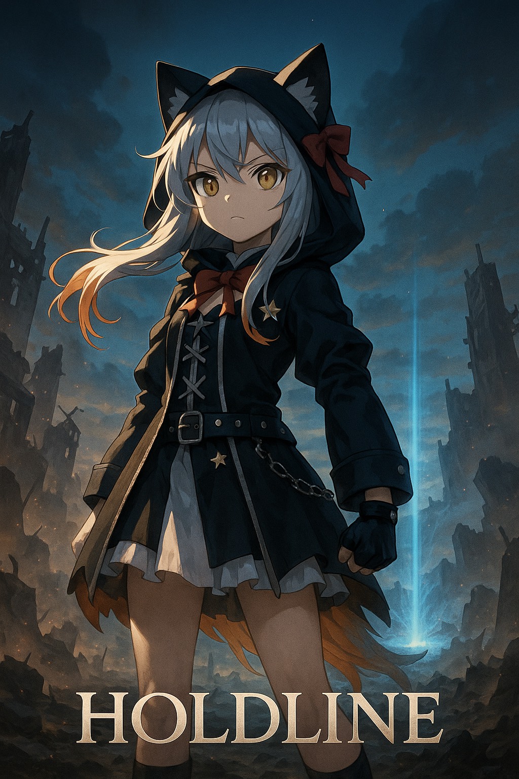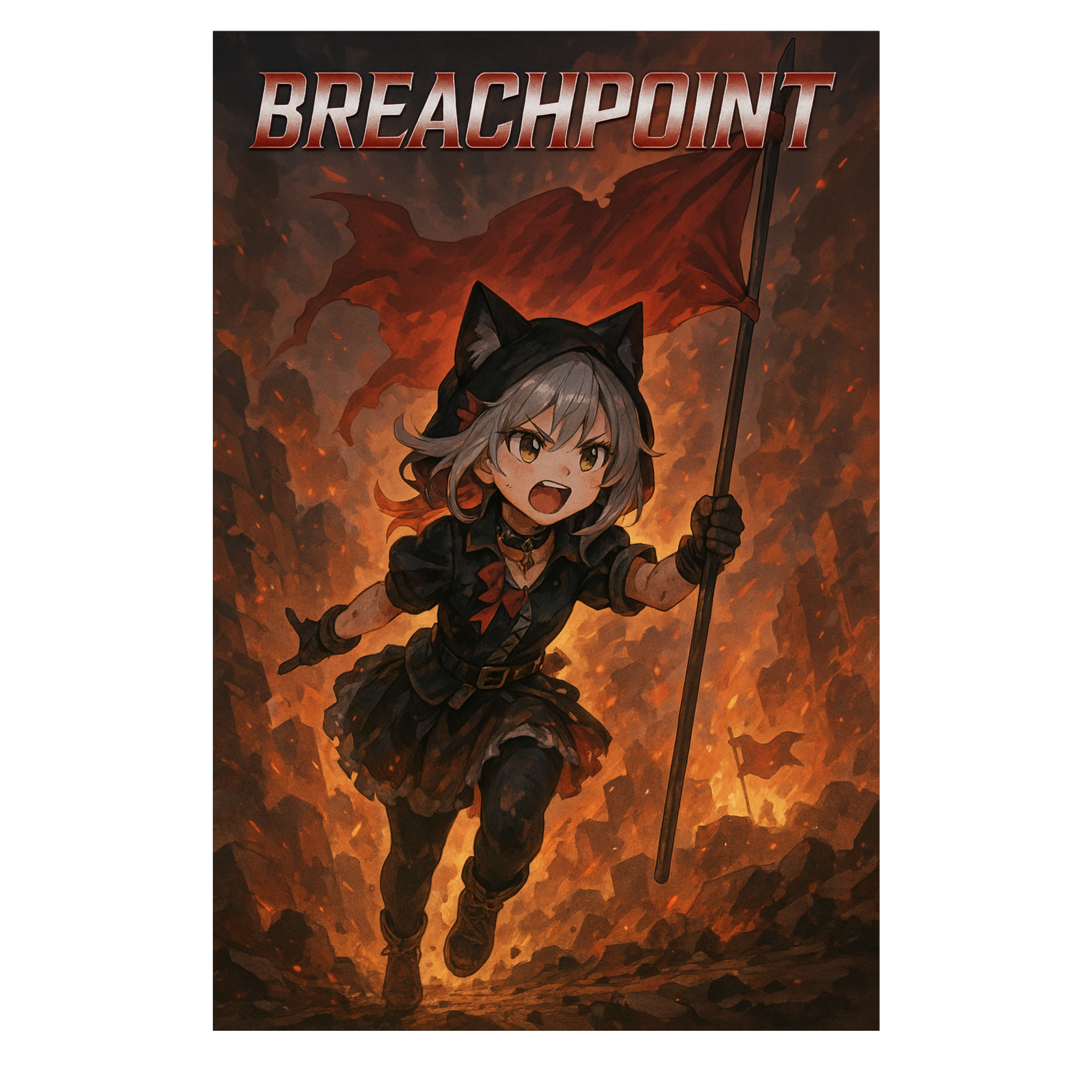 Heavy metal, BPM 160, aggressive, heroic, desperate but determined vibe, cute female Japanese vocal, no harmony vocals, playful but intense vocals, distorted guitars, double kick drums, explosive chorus, builds from isolation to triumphant counterattack