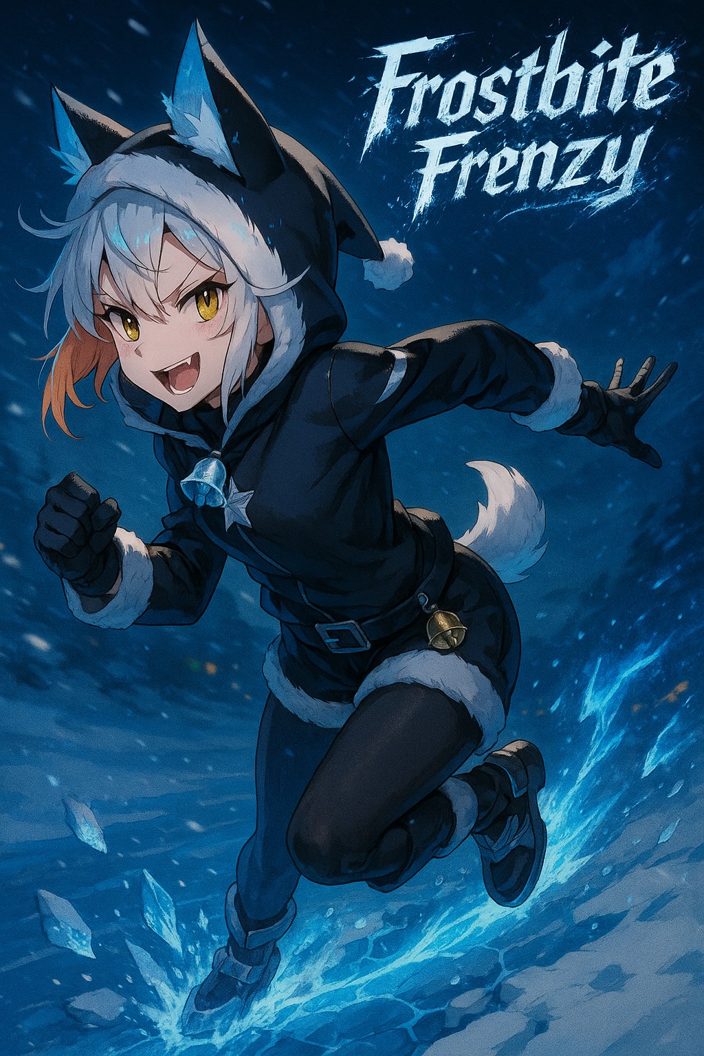 speed metal x hardcore edm x rap, BPM190, cute female Japanese vocal slightly nasal and gritty, no harmony vocals, hyper-fast Japanese rap flow with sharp consonants, icy and frenetic mood, playful but unhinged frenzy tone, metallic jingle-bell hits, distorted guitars punching between rap bars, heavy kick-driven edm drops, glitchy cold synths, rapid-fire syllables, call-and-response style adlibs, breathy attack and sudden cute switch-ups, ice-shatter transitions, aggressive double-pedal drums synced to rap cadence, overall sound like a freezing-night chase turning into a rap-fueled frenzy