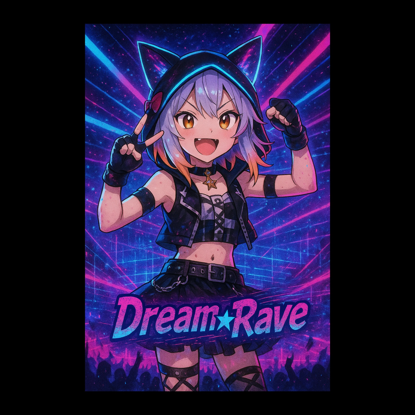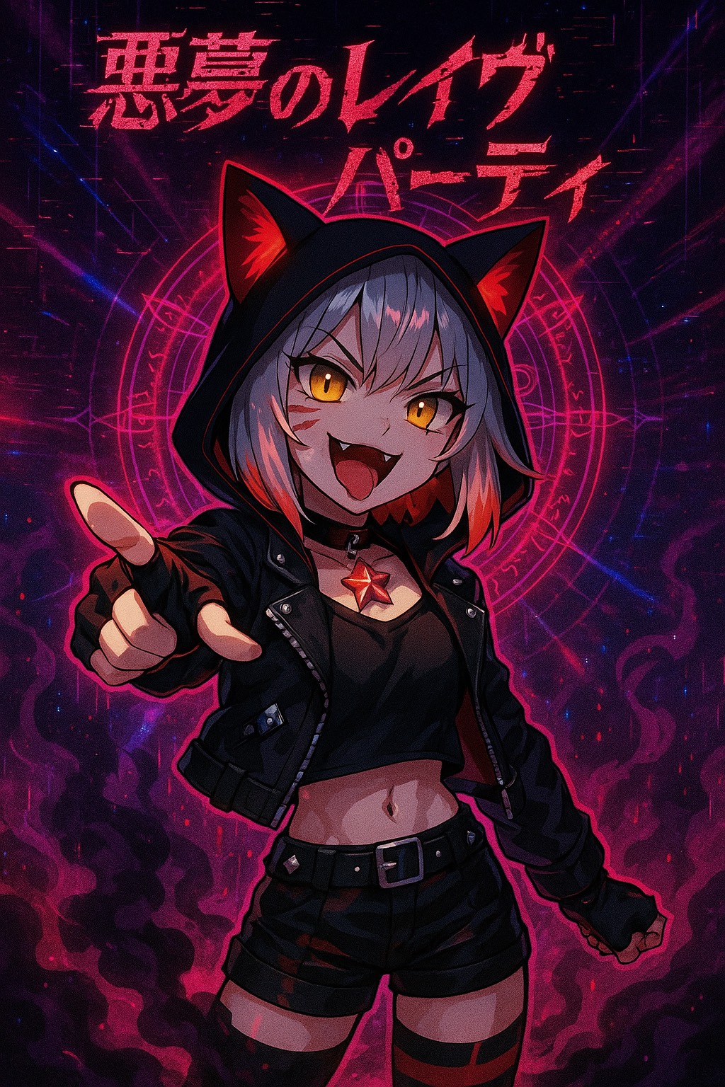 hard EDM, BPM 160, intense, aggressive, playful but fierce, cute female Japanese vocal, no harmony vocals, distorted synths, heavy hard bass, sharp kicks, glitchy leads, nighttime rave chaos