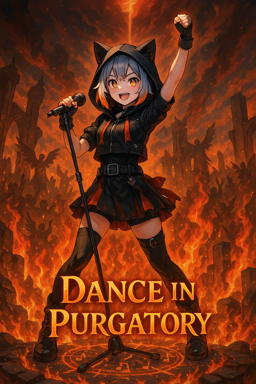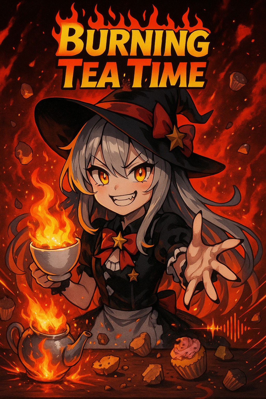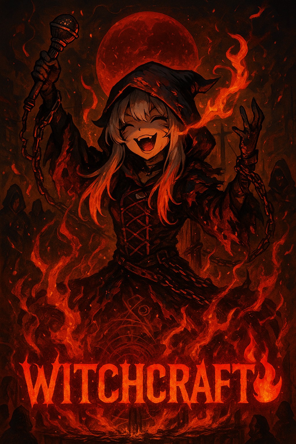 Concept: a witch trial turned live show, The accused girl raps back while burning, turning judgment into a rebellious performance, Flames, rhythm, and madness collide in a dark magical stage