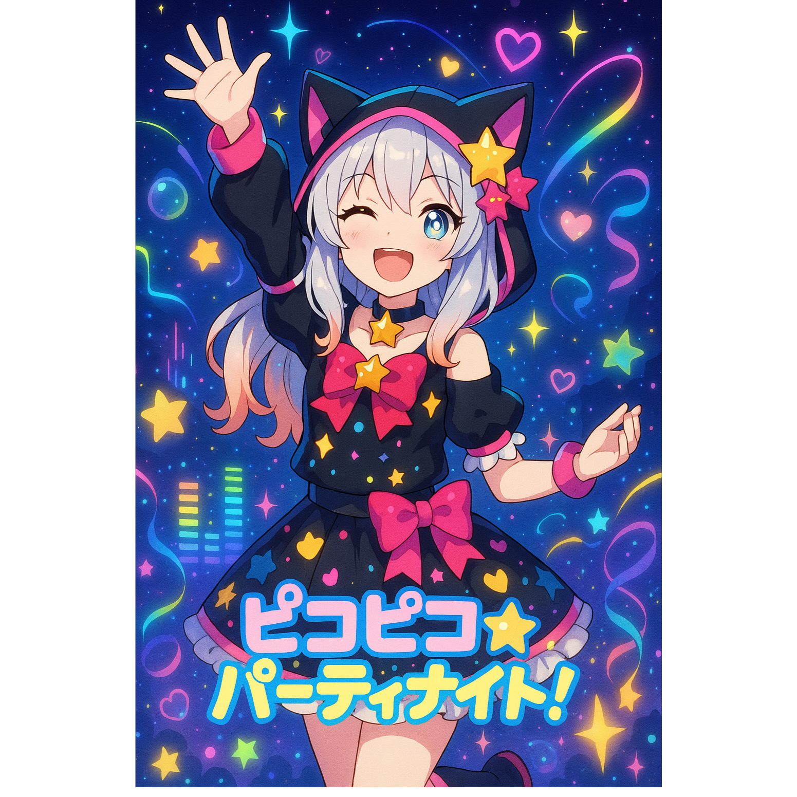 Kawaii EDM, Hyperpop, BPM 155, playful, cute, energetic, bright, glitchy synths, chiptune leads, sparkly effects, punchy kick but light, cheerful party vibe, cute female Japanese vocal, no harmony vocals, playful but gentle, melodic and uplifting