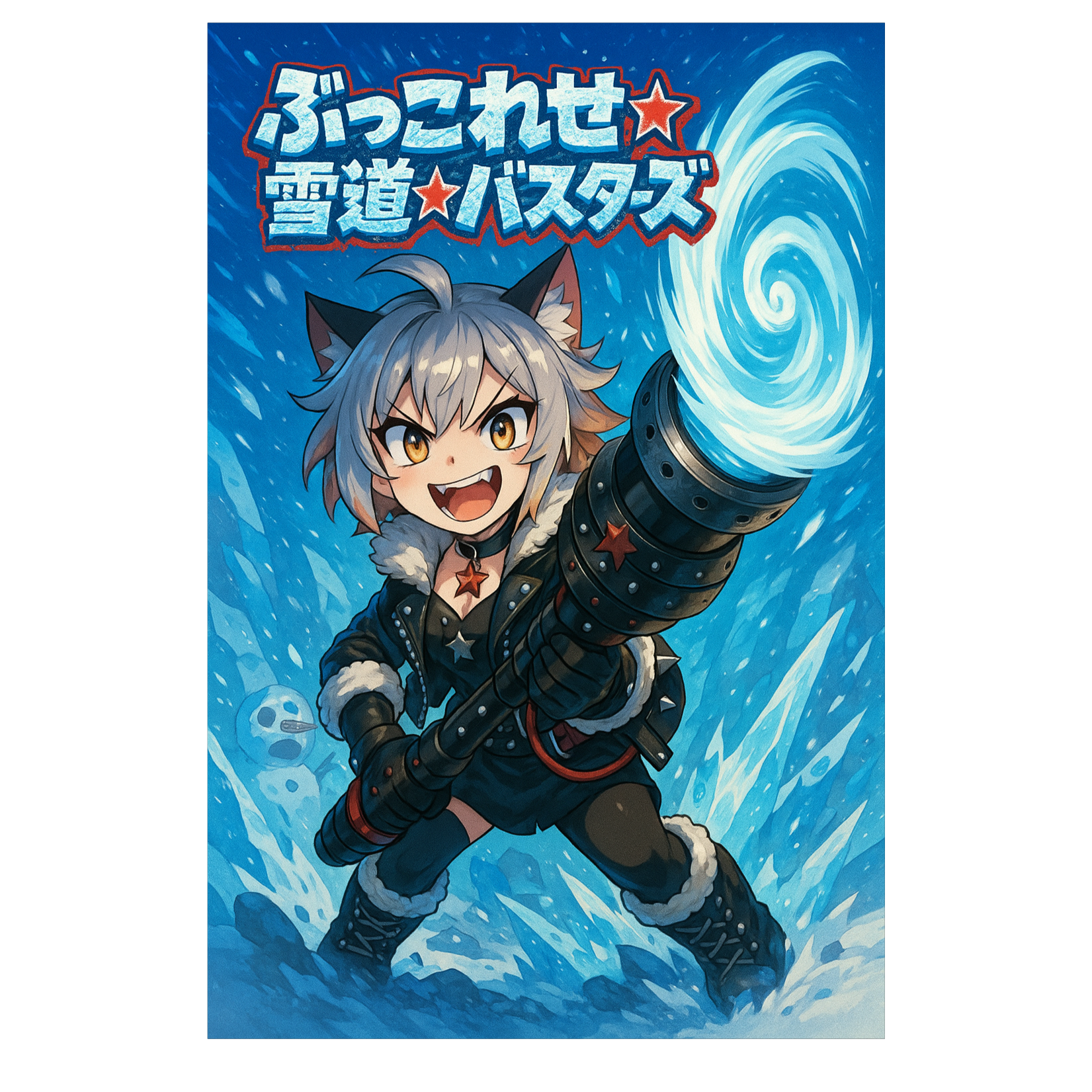 rap-heavy hard trap drum'n'bass, energetic, aggressive, playful but fierce, cute female Japanese vocal, fast-paced rap with mixed Japanese and English phrases, hip hop flow focus, complex rhyme scheme, BPM 170, punchy kicks, deep 808 bass, heavy sub bass drops, sharp hi-hats, glitchy snare fills, double time rap delivery, seamless verse-to-verse flow without crowd calls, layered unison vocals for key punchlines, impact hits synced with beat accents and shovel strikes, snowstorm and ice-breaking sound effects, breakbeat switch-ups, distorted bass growls, half-time breakdowns with massive low end, bright lead synth stabs, low brass stabs for power accents, reverse cymbal swells, short plate reverb on vocals for punch, sidechained pads for drive, no harmony vocals, energetic seamless transitions, occasional glitch FX and vocal chops, maintain relentless high energy to match extreme snow battle theme