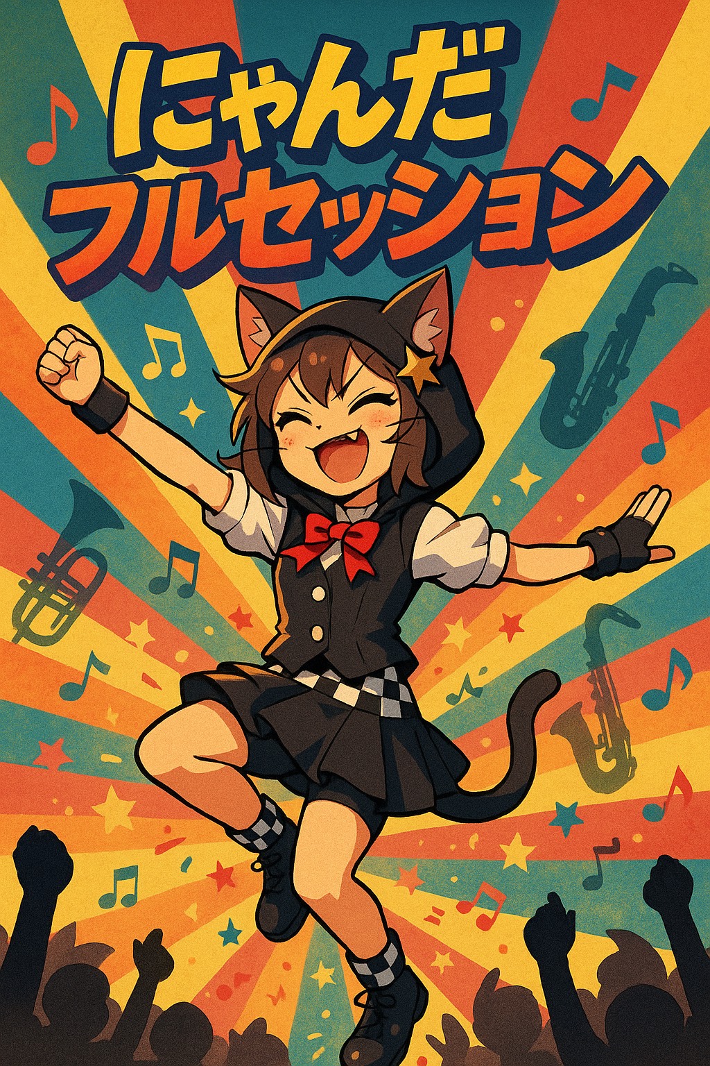 anthemic and catchy hook with explosive drum fills, layered sax melodies, bright rhythmic hits, aggressive yet cute tone, BPM 170, cute female Japanese vocal with confident energy, no harmony vocals