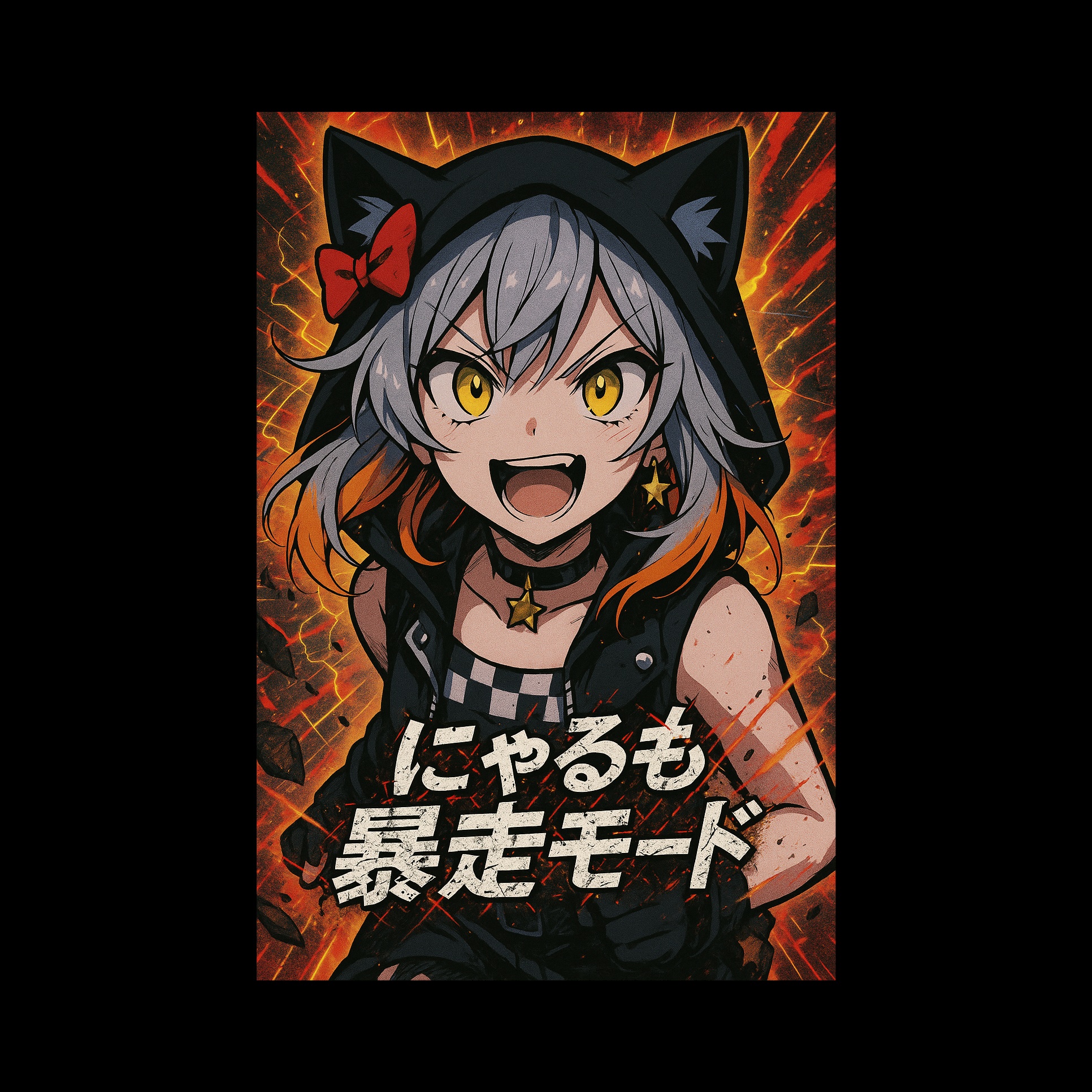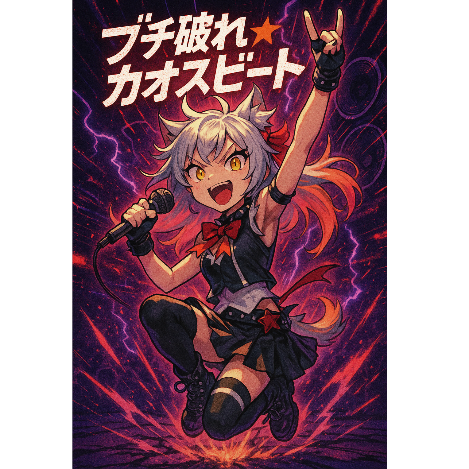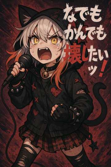 J-pop punk rock, aggressive female vocal, distorted guitars, fast tempo (BPM 170), emotional outbursts, shout and whisper mix, Japanese lyrics, rebellious and chaotic, glitchy effects, raw energy, cat