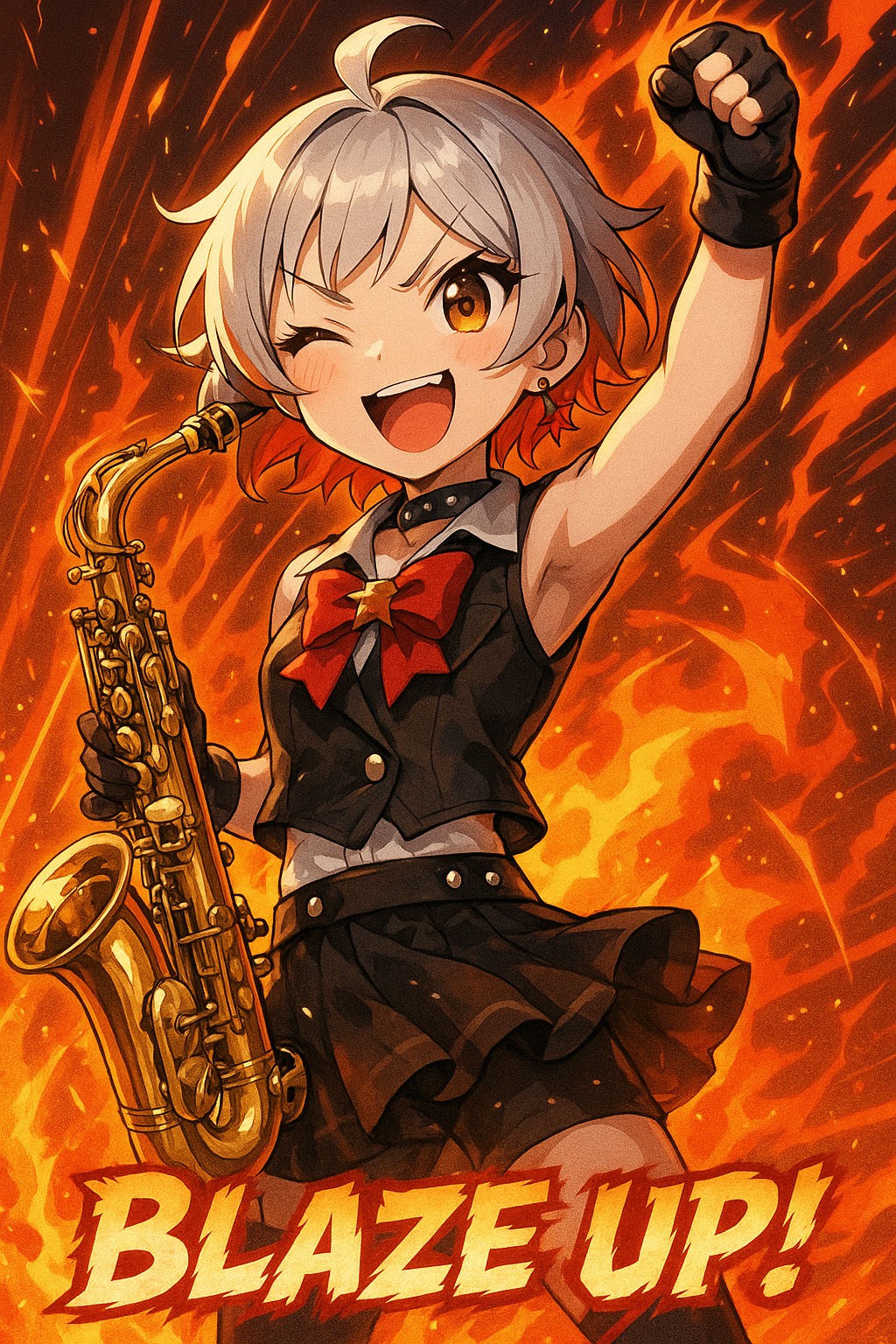 ultrafast intro with pounding drum rolls, sharp sax stabs, energetic rising tension, cute but fierce vibe, BPM 170, cute female Japanese vocal with energetic tone, no harmony vocals