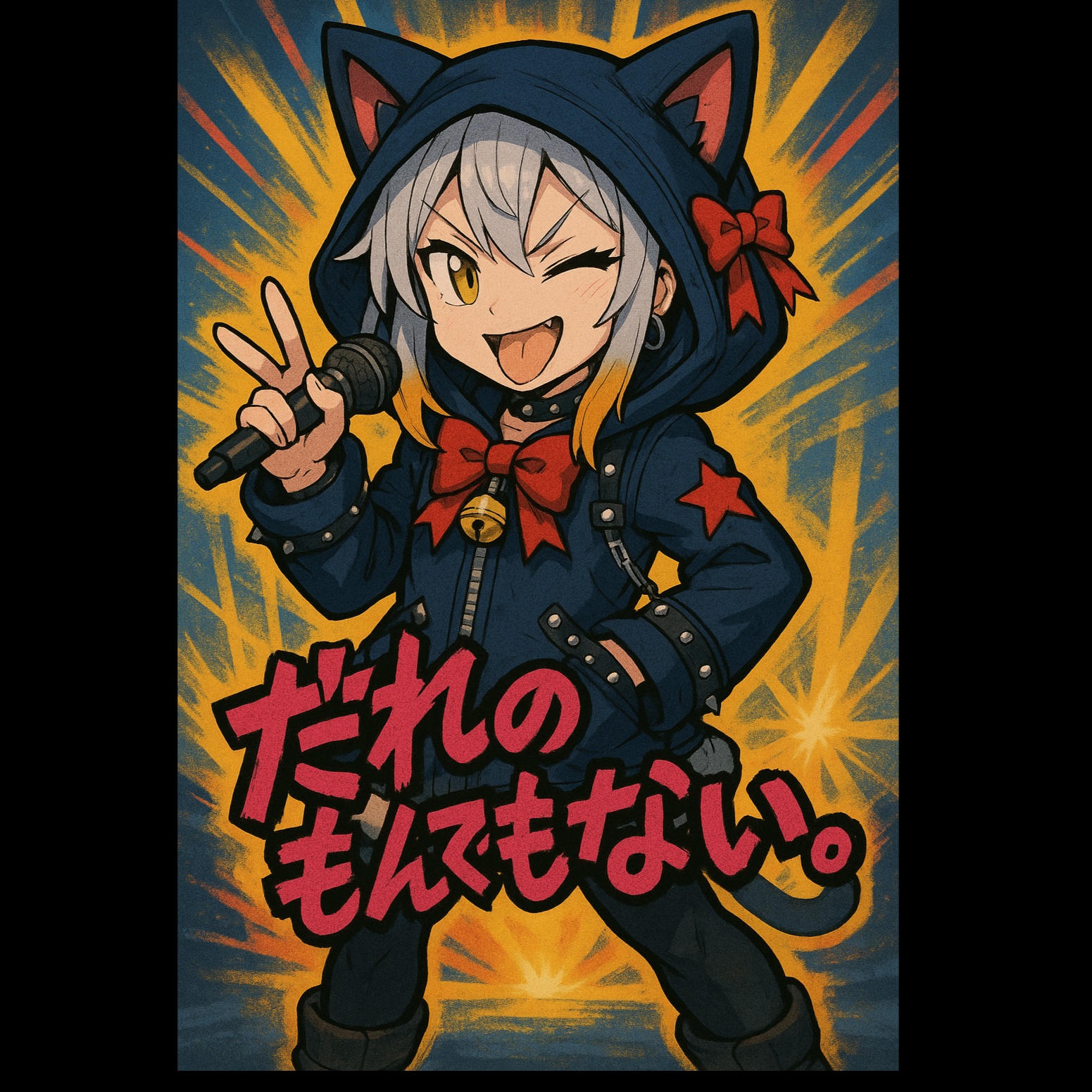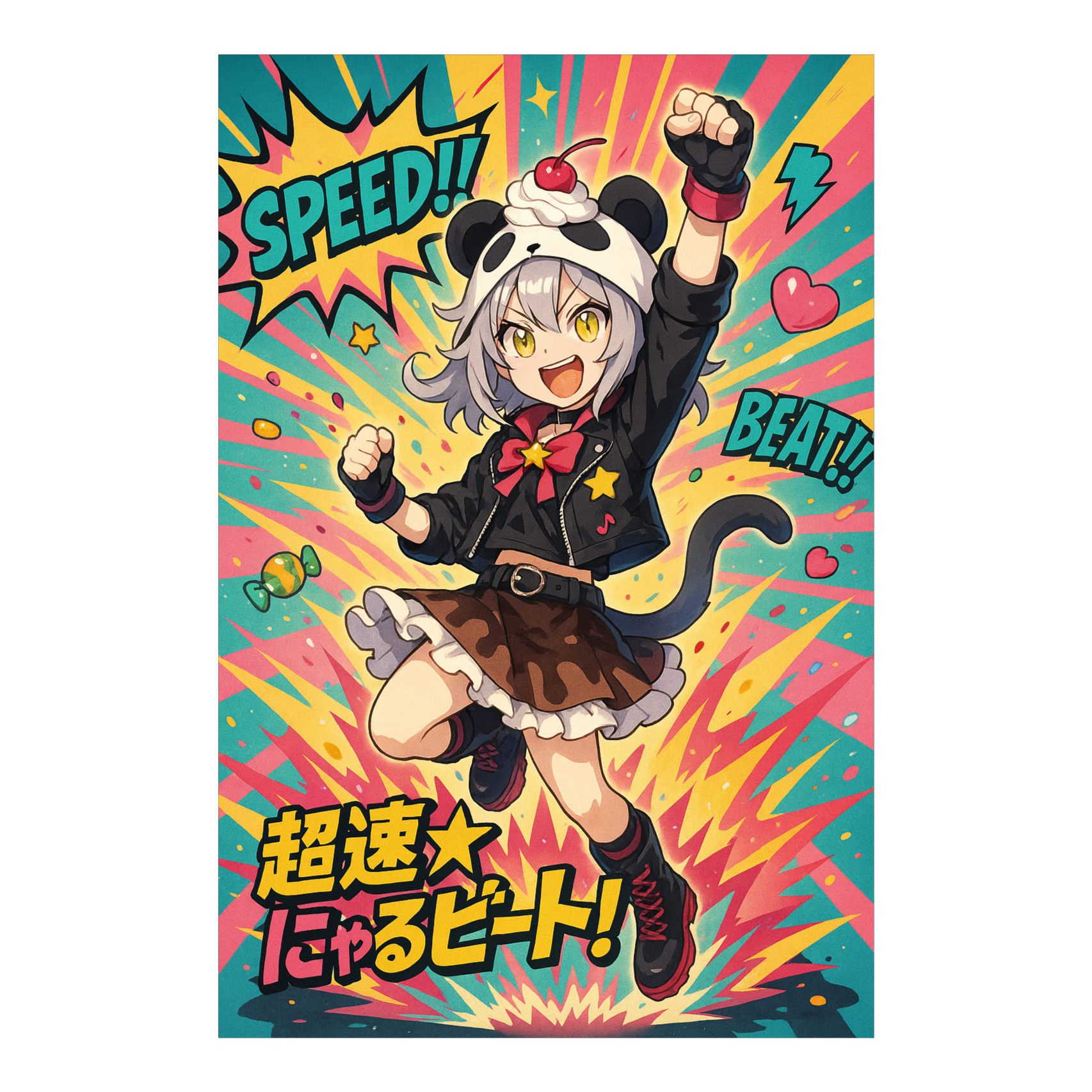 speedcore, cute rap, BPM 210, aggressive, playful, intense, cute female Japanese vocal, no harmony vocals, fast rap delivery, distorted kick drums, glitchy synths, metallic percussions, explosive drops, catchy but chaotic hooks, lyrics mixing Japanese with short English words, focus on rhyme-heavy verses, bridge with distorted noise and rapid build-up, final double hook with extreme speed and playful chaos