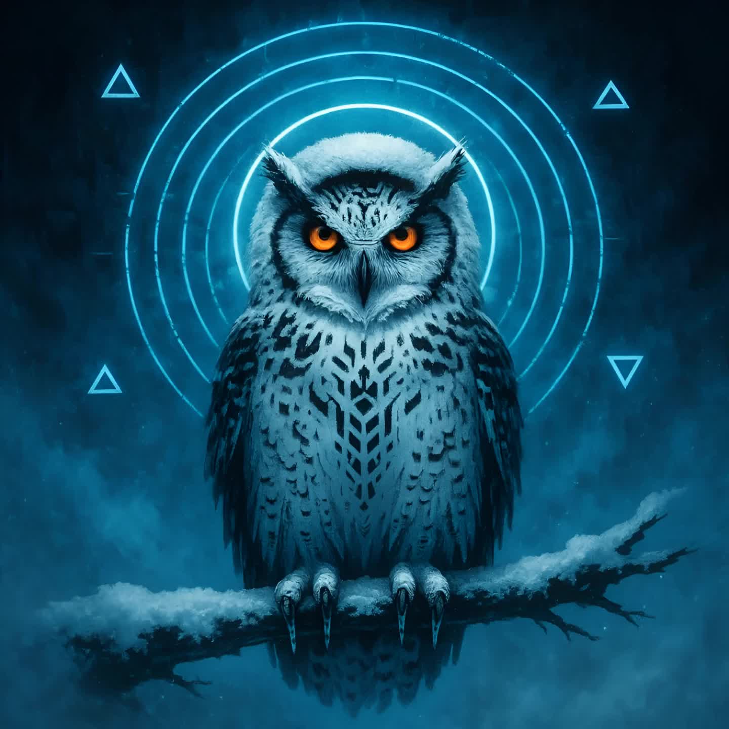 in a Yukhhich Sch🙏🏼 Owl style, Snow Code Hymn-core in broken 6/8 float, Begins with sparse human beatbox groove: deep bass, crisp hats, and layered mouth percussion, Vocoder-processed vocals build into chant-like harmonies, Synths tuned to 963Hz add a mystical base, Abrupt meter shifts and “yukhhich sch” vocal textures introduce avant-garde elements, Intro uses SP404 tape-warped drone pad, VHS grains, and frosty data synth loops, Verses alternate flat TTS chant and vocoder-glided human bleed, Hook layers chant-syllable harmonies, vocally rendering emojis; sidechained choir textures swell, Bridge brings glitch interference, signal stacking, and icy gates, Second hook intensifies harmonic bleed, leading into an interference phase of chopped mono telecast, Ends with a ritualistic, synthetic outro of vocoded chant and tape-warp drone decay