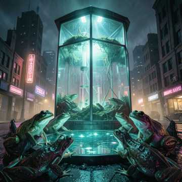 DO NOT SING, THIS IS SPOKEN WORD ONLY, Spoken word narration, A soothing, dramatic monolog delivered by clear strong male voice foreground, poetic cyberpunk storytelling, melancholic or calm tone, pure spoken word, NO singing, the speaker's voice is clear and close-miked, cinematic performing voice act, the background features a subtle brooding 1990s thriller score: low, pulsing synth drones with detuned strings and sparse tom hits; tense high-pitched pads creep in like sirens, Gradual build from stealthy unease into frantic rhythmic stabs as the frogs storm the facility; occasional metallic percussion and distant choir swells heighten the apocalyptic scale, Perfect for quick-cut action scenes and eerie wide shots of overrun human cities, soundtrack