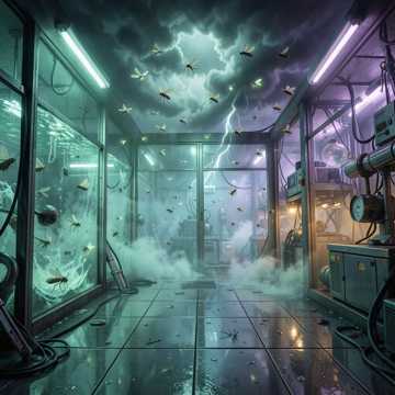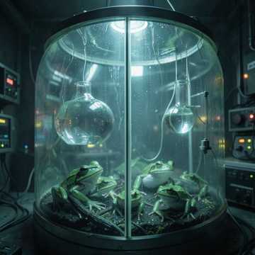 Creeping 90s thriller score with sparse, detuned strings, dry pizzicato motifs for the frogs’ scuttling advance, and low, ominous sustained cellos for the apocalyptic backdrop, Gradual layering of dissonant violas, muted brass swells, and metallic percussion ticks to build tension; midway break shifts to a chaotic, chromatic string ostinato as the facility falls, then pulls back to eerie, skeletal pizzicato and soft choir pads for the final uneasy tableau, soundtrack