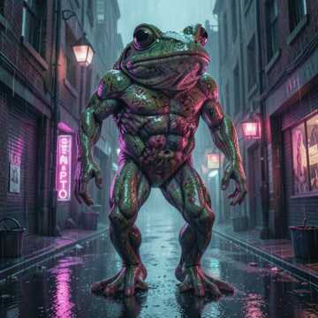 Creeping 90s horror soundtrack, minor-key strings and low synth drones, Pizzicato strings skitter in odd patterns to trace frog jumps; occasional dissonant stabs and orchestral swells build tension, Dark pads and distant choir swells create a brooding bed while bass pulses rise slowly, Irony comes from quirky off-kilter woodwind flourishes and awkward, almost comic timing in the rhythms, low, playful, soundtrack, slow
