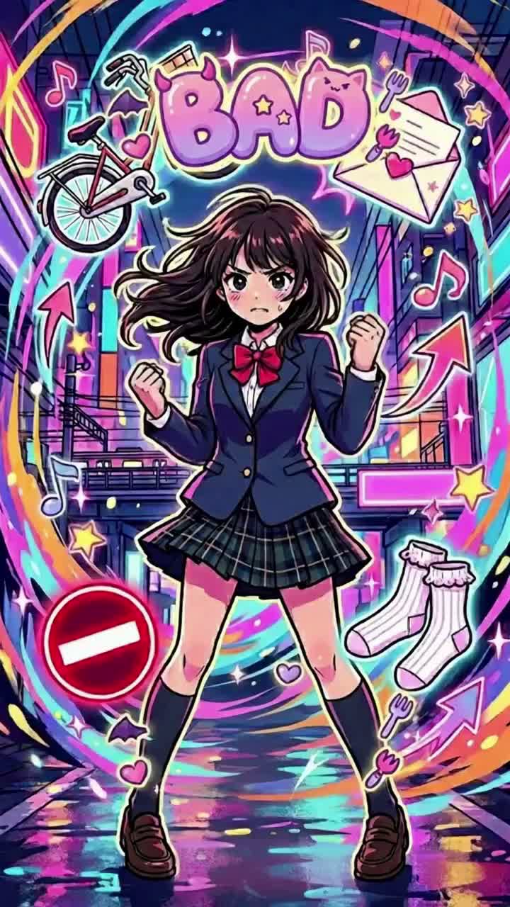 Feel: Bright, mischievous, wannabe-bad-girl energy; playfully rebellious with a wink; trying-so-hard-to-be-naughty school-life anthem; impish grin throughout