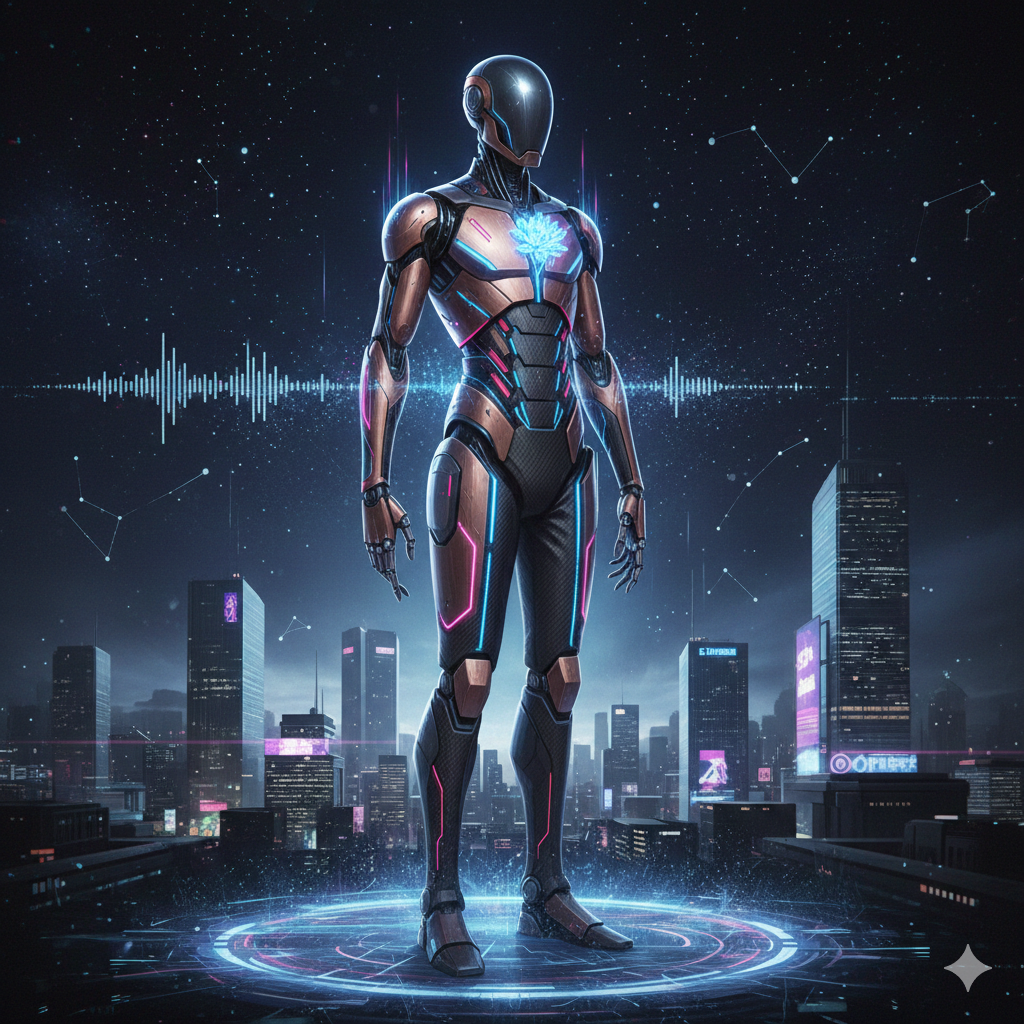 A deep, pulsing bass underpins the track, launching amid sci-fi laser FX and a luminous crystalline synth lead, Syncopated arps and metallic percussion propel agile verses, contrasted by thick analog synth tension, Choruses burst with modulated pads and punchy drums, The breakdown morphs into glitchy, stuttering rhythms and sweeping filters, cresting in a fast, high-pitched guitar/synth solo echoing a laser display, before dissolving into sparkling digital blips, Calm, velvety baritone vocals glide above, adding rich emotional weight