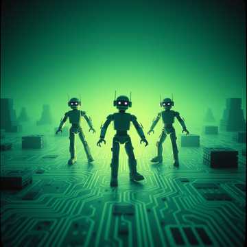 A dystopian electronic composition, opening with a theremin’s uneasy tones emulating EM waves, layered over erratic broken MIDI glitches from piezoceramic actuators, Verses feature stark, metallic percussion with fractured synth textures, while sampled radio fragments and scrambled transmissions punctuate transitions, Industrial bass rumbles below, and neural feedback pulses cut through sections, building tension, The bridge dissolves structure—a wash of digital static, jarring processed vocals, and echoed stabs—before slamming into a relentless, polyrhythmic outro where all elements surge, disorient and collide