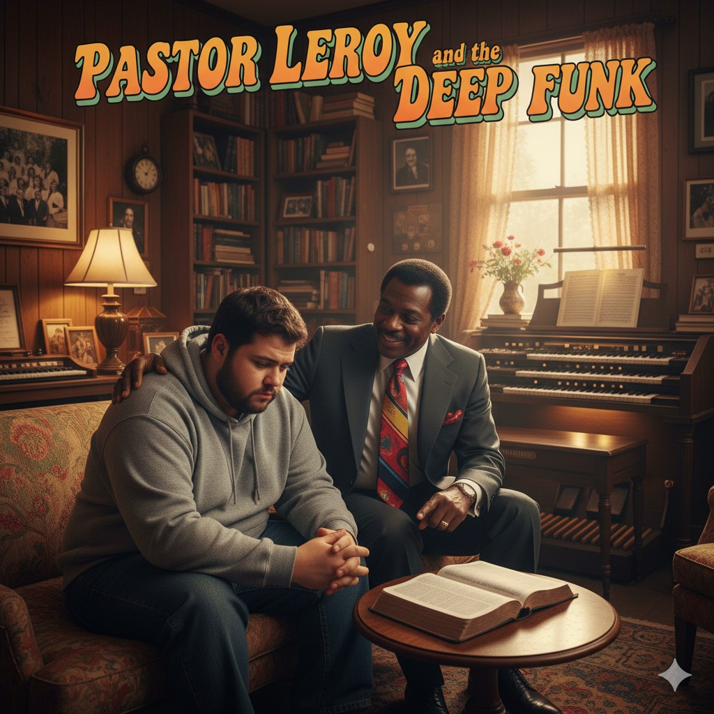 Soul-Jazz Funky Blues, Funky groove, 130 BPM, Deep walking bassline, warm Hammond B3 organ, slow rhythmic blues guitar, Vocal Phrasing: Conversational, slow-burn storytelling, Vocal 1: Young male Tyrell TENOR, frustrated and weary, Vocal 2:Pastor Leroy Mature male BARITONE, very deep, gravelly, authoritative, Strictly distinct male voice of PastorLeroy and male voice of Tyrell, Complex harmonies, interwoven melody lines