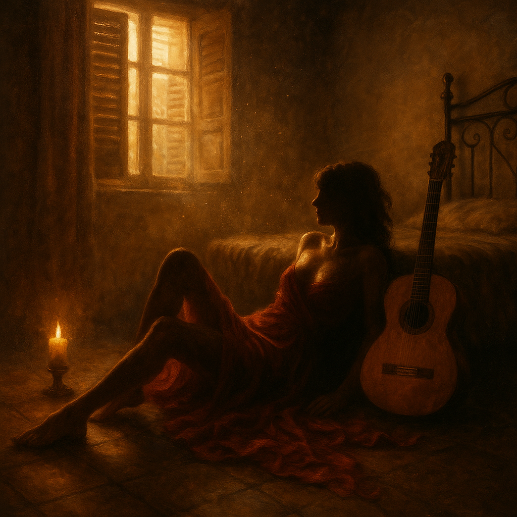 Spanish acoustic rock ballad inspired by 90s romantic songwriting, featuring warm fingerpicked flamenco guitar, soft cajón percussion, subtle fretless bass, and intimate male vocals with raspy emotional delivery, Melody evokes Andalusian influence with poetic phrasing and heartfelt dynamics, Structure flows from quiet whispered verses to expressive choruses with restrained rock instrumentation and string textures, Emotional lyrics explore desire, identity and surrender through sensual metaphors and deep romantic imagery, Piano highlights introspective sections, while Spanish guitar solo adds melodic intensity, Natural analog-style production with warm compression, room reverb and close mic intimacy, Tempo around 72 BPM in 6/8, creating a slow, swaying rhythm, Ideal for evoking soulful Spanish passion with lyrical elegance, reminiscent of heartfelt Spanish rock ballads rooted in love, longing and emotional vulnerability