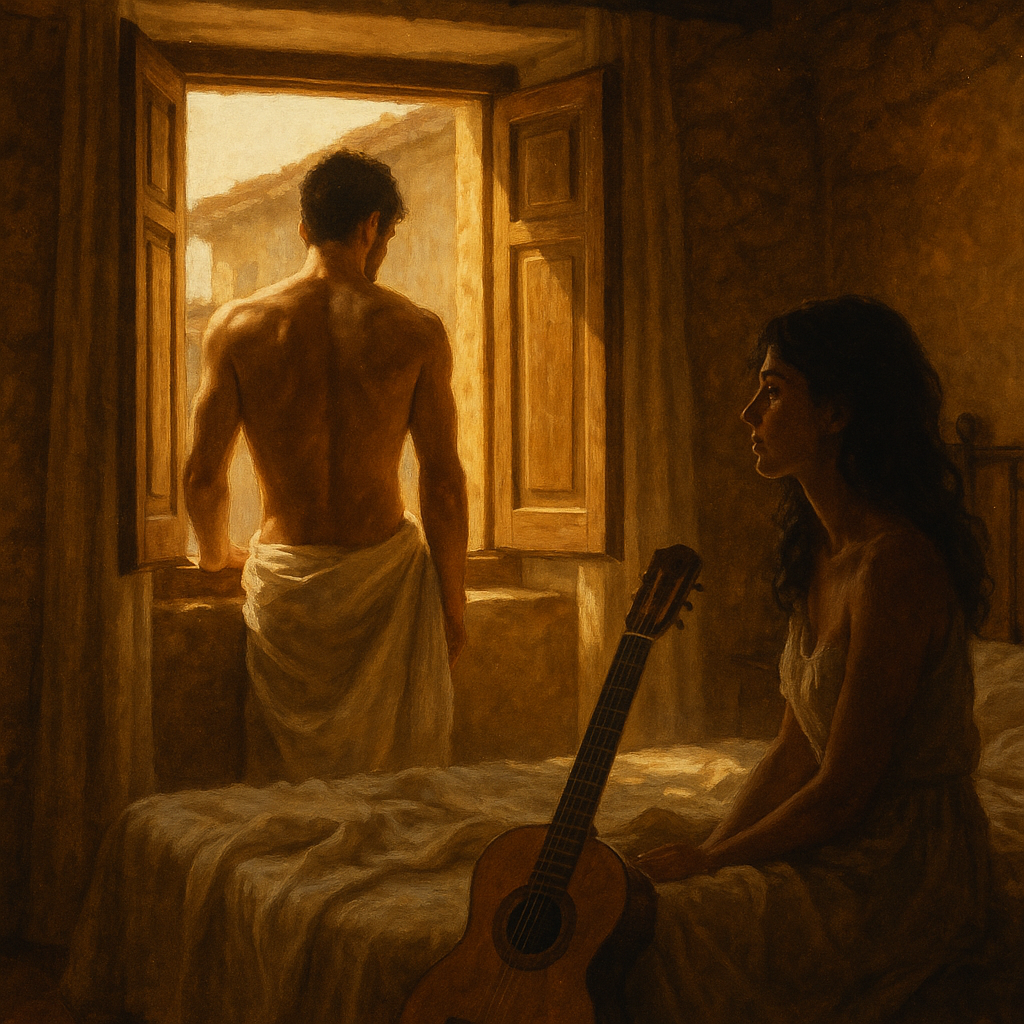 Emotional male vocals, Spanish guitar, poetic lyrics, flamenco-folk fusion, soft ambient textures, deep cajón rhythms, heartfelt and nostalgic, Spanish cantautor pop-rock ballad featuring deeply emotional raspy male vocals with Andalusian gypsy inflections and agitanada voice texture, steel string acoustic guitar fingerpicking in E major at 103 BPM building to warm electric guitar chords, subtle piano touches, steady bass guitar and soft drums, Melancholic and romantic atmosphere with passionate delivery reminiscent, Chord progressions A-E-B-E4 with Spanish cantautor modulations, Verses sung with intimate vulnerability and slight vocal rasp, choruses building emotionally with electric guitar warmth but maintaining singer-songwriter intimacy, Guitar work combines acoustic fingerpicking with electric chord accompaniment featuring Spanish pop-rock sensibility, Production style: warm analog recording with natural room reverb, minimal compression to preserve vocal texture