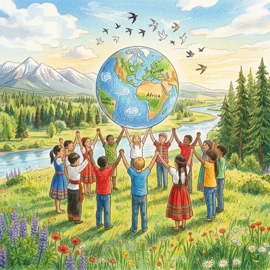 90s classic boy band pop, pop ballad, dance pop, uplifting anthem, 98 BPM, bright major key, youthful male group vocals, emotional lead male vocal with rich boy band harmonies, layered vocal stacks, smooth pop production, rhythmic claps and snaps, upbeat pop drums, warm acoustic guitar, bright piano chords, soft electric guitar accents, melodic bass groove, inspirational and hopeful mood, lyrics about saving the earth, peace and unity, global friendship, call and response vocals, big sing-along chorus, emotional bridge, gradual build, children’s choir joining in the final chorus, layered boy band and kids choir harmonies, powerful anthem finale, stadium-style sing-along ending, cinematic uplifting ending, approximately 3 minute song