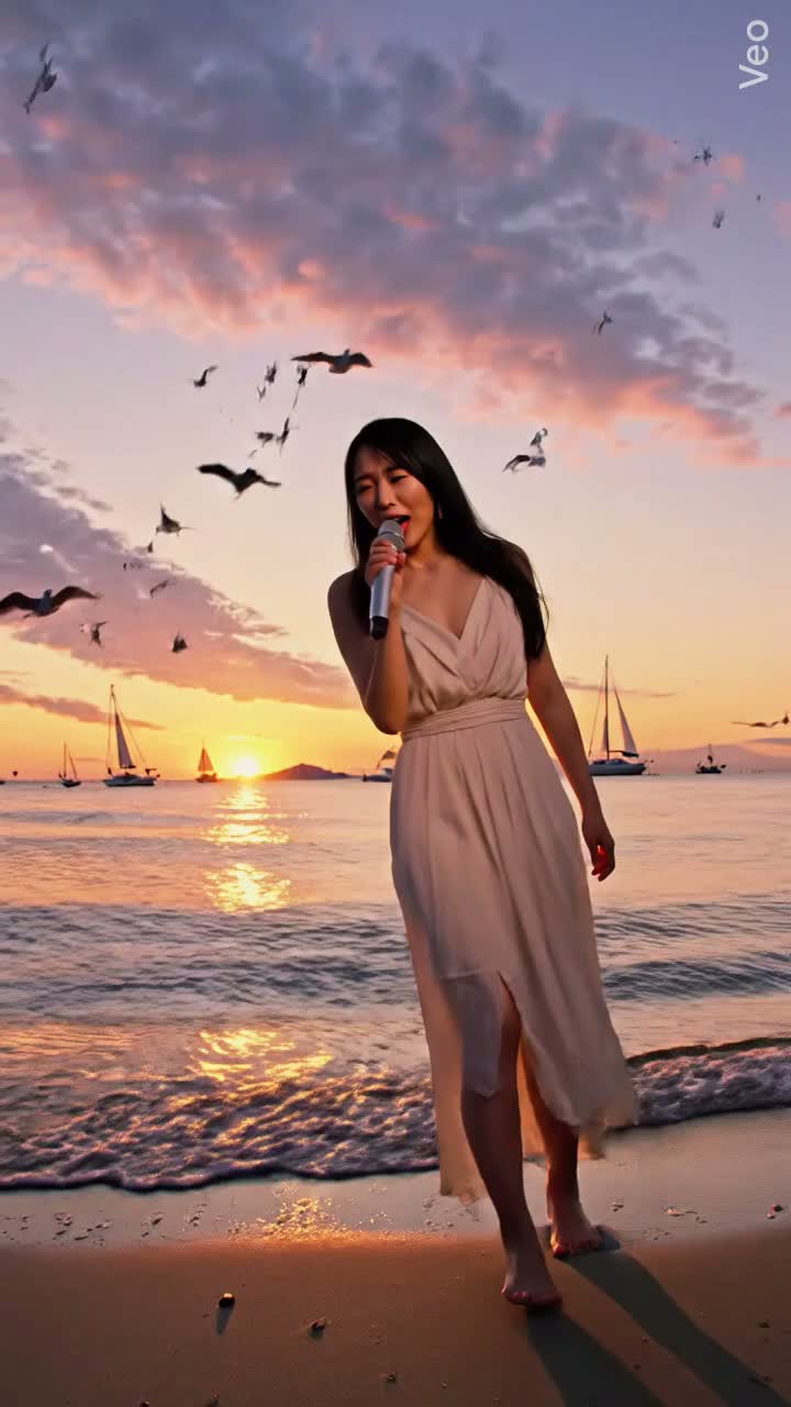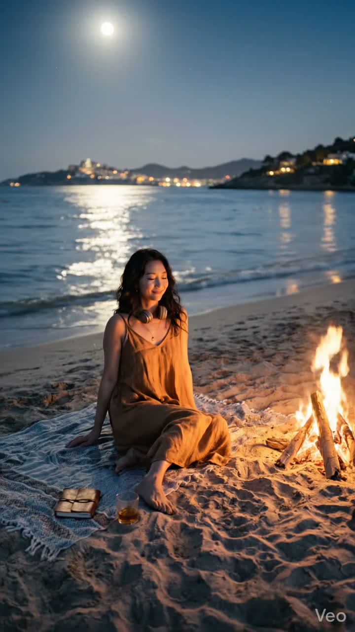 Soft Korean female vocal with a clear, airy, emotional tone inspired by early IU, Light, intimate delivery with subtle breathiness and expressive dynamics, Tempo around 92–100 BPM, Key in a comfortable mid range (avoid overly high belts), focus on sweetness and emotional storytelling rather than power, Genre: Bossa Nova influenced acoustic pop with modern K-indie production, Soft Bossa Nova acoustic pop with light Warm nylon guitar rhythm, soft jazz brushes on drums, gentle upright bass groove, Add light electric piano (Rhodes style), subtle ambient pads, and minimal percussion (shakers, rim clicks), Keep arrangement clean and spacious, Mood: romantic night by the ocean, soft sea breeze, glowing bonfire on the beach, slightly dreamy and whimsical but emotionally sincere, The verses should feel delicate and intimate, almost like whispering a secret, Pre-chorus gently builds with harmonies and light strings, Chorus should bloom softly — not explosive, but emotionally lifted and glowing