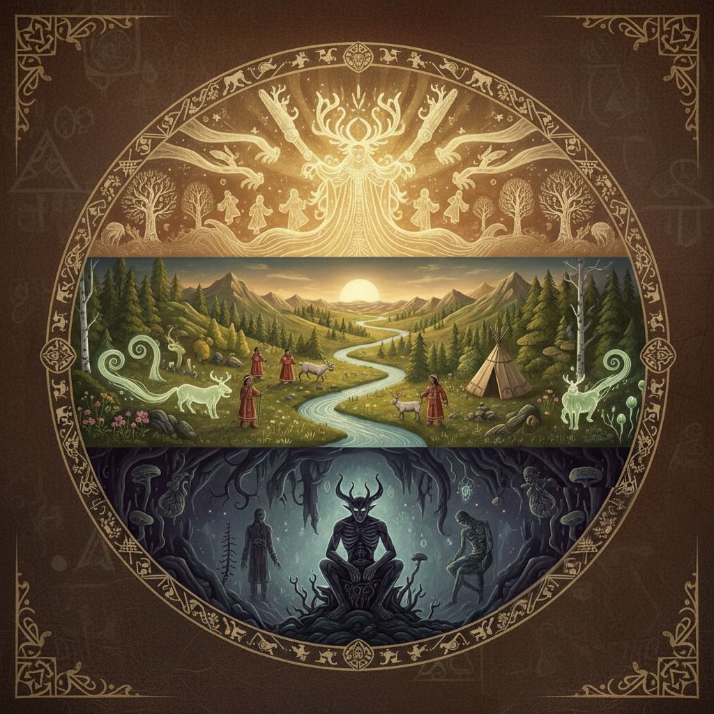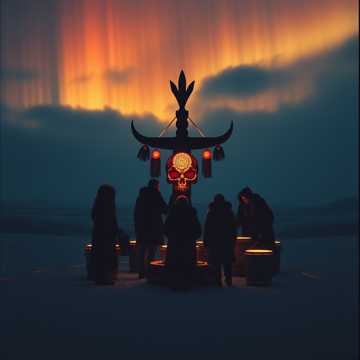 Deep guttural baritone male shamanic chanting, Tungusic ethnic folk, ritual frame drum and voices, jaw harp khomus, cinematic dark ambient electronica, lush synthesizers, wild low shaman vocals echoes, hypnotic tribal rhythms, New Age, mystical, immersive soundscape