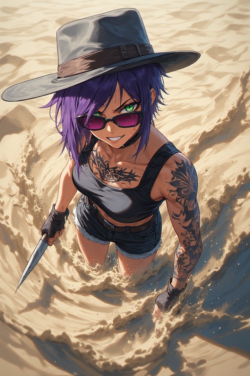 Gritty female voice, dark Punkmetal, Punk-Rock, Popcore, Electro-Metal, Synthwave, House, Swancore, Post-Grunge, intense, Minor-Chord, Minor-Key, E-Guitar, gritty, dark tone, very aggressive Guitar-Riffs, Heavy, intense, atmospheric, base guitar, brutal, menacing, beach vibes, underwater, Lo-Fi, twisted, colorful, little upbeat, violent, breakdown, Breakbeat, hardtek, electronic
