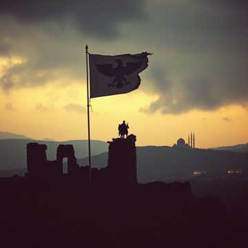 epic power metal, aggressive male vocals, melodic singing, heavy double bass drums, war drums, dark orchestral, Balkan folk elements, choir of men