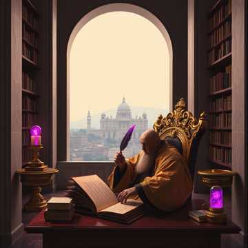 progressive symphonic metal, male tenor vocals, melodic singing, acoustic passages, complex time signatures, scholarly atmosphere, building orchestral, triumphant finale, quill scratching sounds