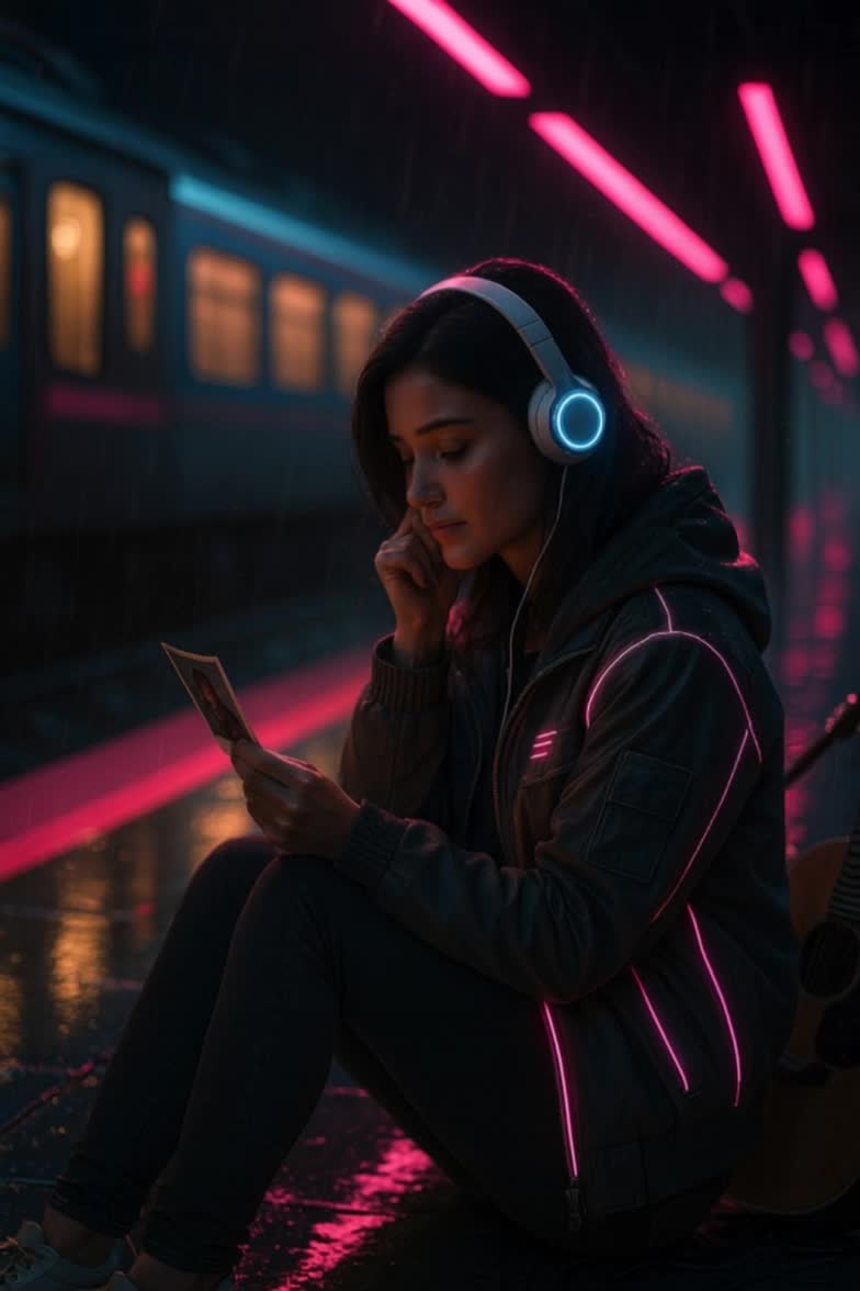 Cyberpunk Pop + Ballad Rock + Mariachi Mexicano, Tempo 90 BPM, Female voice only – soft, expressive, nostalgic, close-mic’d with emotional delivery, Add guitarrón mexicano and vihuela blended with Rickenbacker 4003 bass using light fuzz for a warm gritty layer, Start minimal with lo-fi electric guitar, ambient pads, analog noise, and subtle vihuela textures, Verse sections are intimate and simple with violins sustaining long emotional notes and light delay on vocals, Chorus: dreamy synth textures, soft mariachi trumpets, stereo widen, slight vocal layering, Maintain repetition to build mood rather than complexity, Keep vocals forward and human, Avoid percussion-heavy drops; use emotional mariachi groove instead, Outro: glitchy textures, soft distortion, fading trumpet and violin lines as the final phrase repeats and dissolves, No male vocals, Atmosphere sad yet sweet like a neon-lit memory with Mexican soul, Final mood: melancholic, cyberpunk, introspective, and gently hopeful