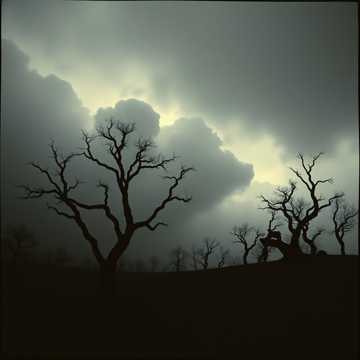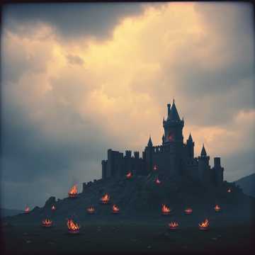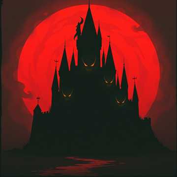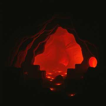chaotic guitar riffs, argent metal; blistering double-kick drums, eerie synth textures, guttural growls, male vocals growling from the abyss, intense, demonic, metal