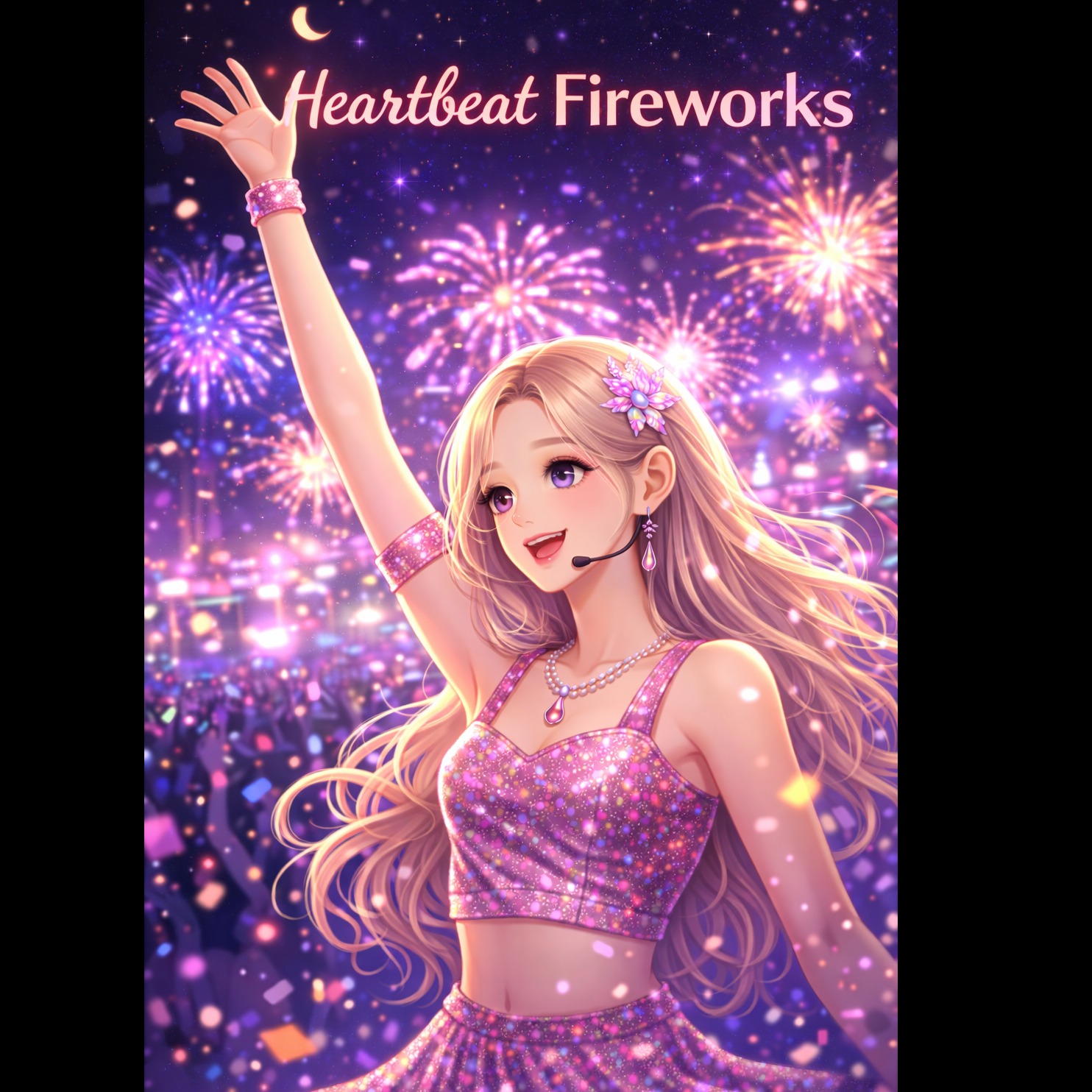 K-pop EDM dance pop song, soft sweet female vocals but energetic delivery, youthful expressive Korean pop singer, polished studio vocal, layered harmonies, Short-form radio edit, fast intro, short energetic verse, strong rising pre-chorus, explosive festival-style melodic chorus, brief chorus repeat, quick powerful ending, modern K-pop production, bright festival synth leads, punchy drums, strong EDM drop, crowd-energy atmosphere, dancing in a festival crowd, hearts racing, explosive happiness, shared excitement, Mood: euphoric, energetic, bright, celebratory, Same vocalist and cohesive album production style, melodie