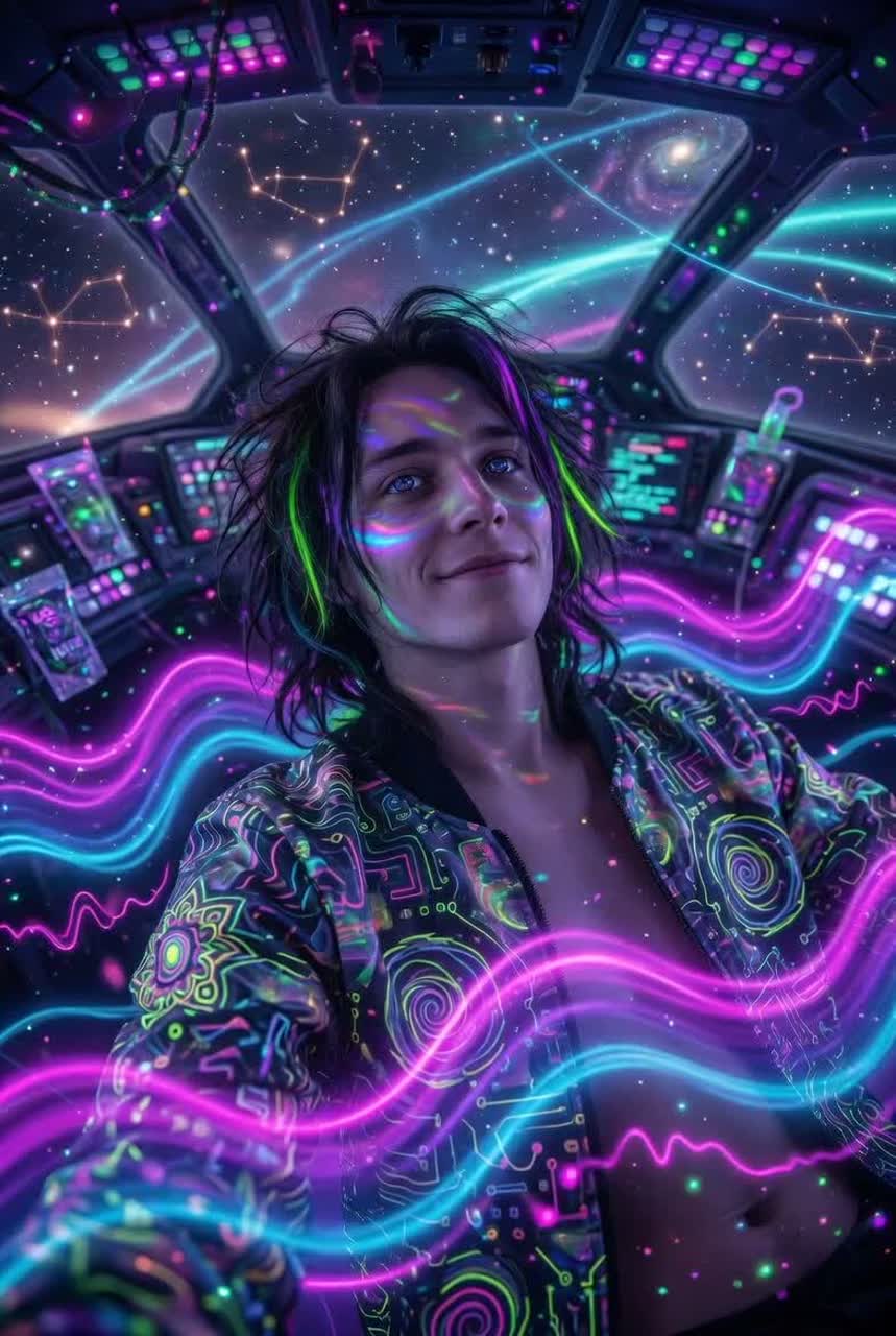 Psytrance / space-club hybrid, 138 BPM, F# Dorian, driving 4/4 with rolling triplet feel, Tight punchy kick, offbeat psy bass with subtle FM movement, layered with sub glide, Percussion: syncopated hi-hats, metallic ticks, filtered fills, occasional halftime switch-ups, Atmosphere: wide cosmic pads, granular textures, orbital sweeps, glitch artifacts, Hook: chopped vocal loop from “come on my spaceship” processed with stutter + pitch automation, Verses: restrained groove, minimal elements, vocal upfront with rhythmic phrasing, Chorus/Post: full energy, stacked synth leads (acid line + airy detuned layer), Breakdown: beat drop, floating ambience, whispered ad-libs stretched and reversed, Vocals: male, smooth but controlled, slightly detached tone, heavy delay throws, spatial reverb tails, Mix priority: kick/bass locked, vocals slightly behind, FX wide