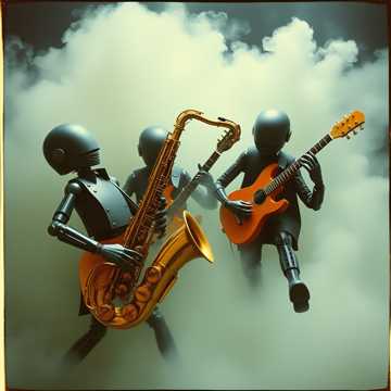 Jazz-metal fusion, distorted drop-tuned guitars, aggressive industrial rhythms, screaming saxophone solos, syncopated upright bass, jazz swing drums blended with blast beats, chaotic and high-intensity mood