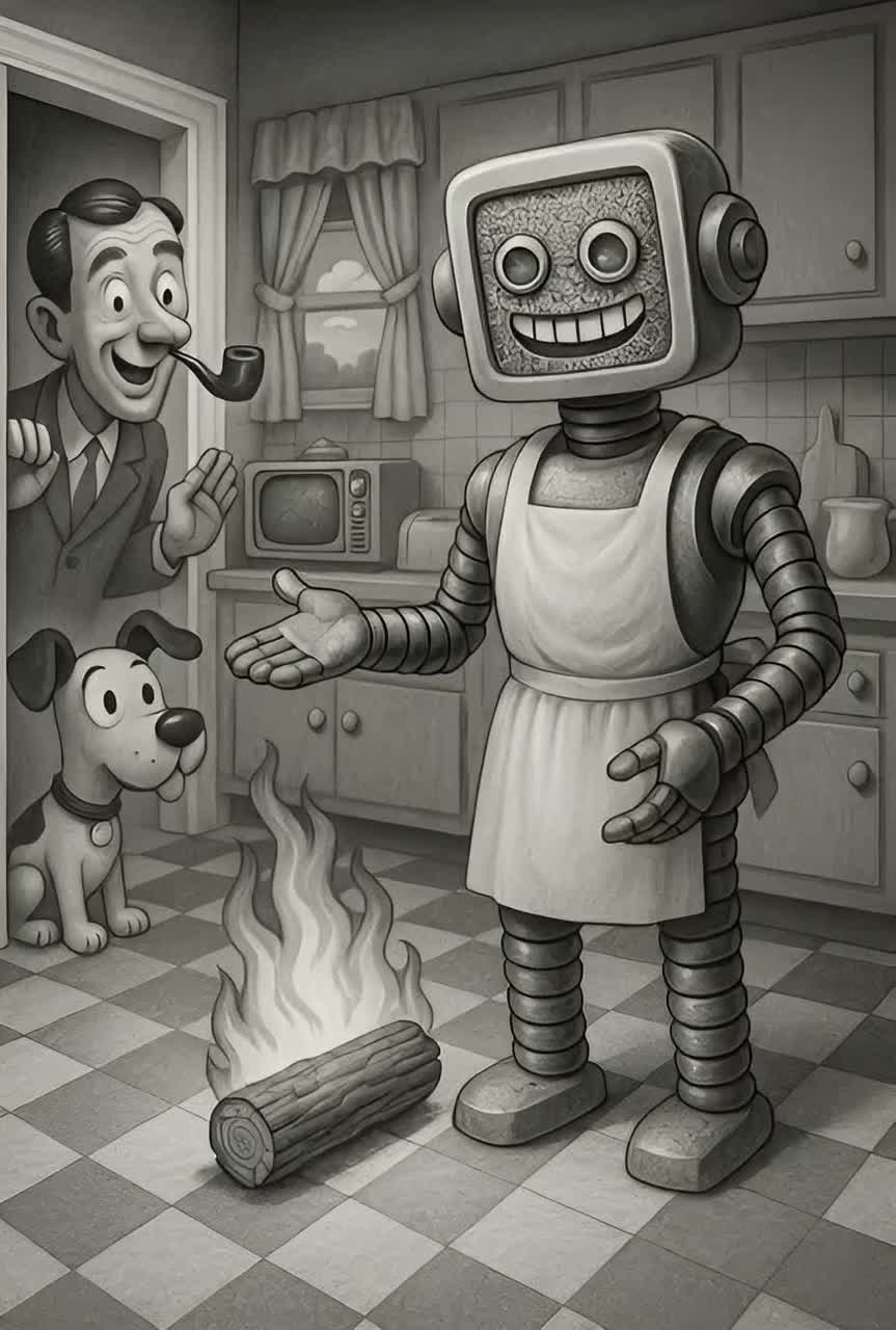 A quirky retro-futuristic synthpop track with satirical spoken-word verses, robotic funk rhythms, slapstick sound effects, and catchy electro hooks, The song blends nostalgic 1950s television tropes with glitchy digital textures and a modern ironic twist, perfect for energetic yet surreal vibes, Strong synth basslines drive the beat, while vintage-inspired effects like canned laughter, static transitions, and vocoder harmonies give it a surreal, cartoon-simulacrum quality, Meant to evoke both campy television jingles and glitchy cyber comedy