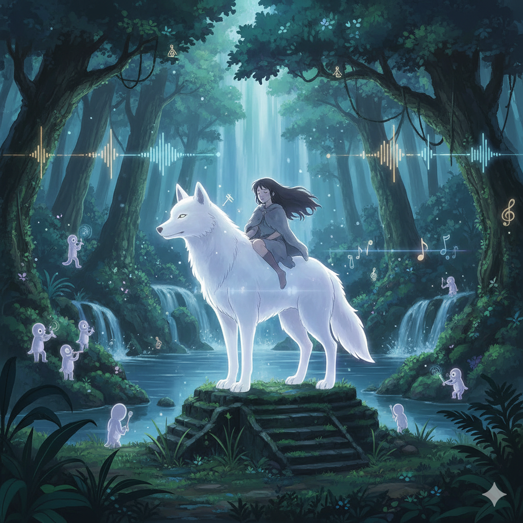 Organic Deep House, Tribal Rhythms, Ainu Mukkuri, Ghibli Cinematic Melodies, Meditative, Spiritual, Genre: Minimal organic house / spiritual tribal techno, Instrumentation: Deep sub-bass, powerful four-on-the-floor kicks, Ainu mukkuri (mouth harp) loop, Ainu singing samples (upopo), warm synths playing Ghibli melodies, raw percussion (chikapopo), Mood: Meditative, cinematic, animatic, hypnotic, deep groove, Key elements: A continuous, repetitive groove centered around mukkuri and tribal percussion, layered with fragments of classic Ghibli songs (Mononoke Hime or Nausicaä)