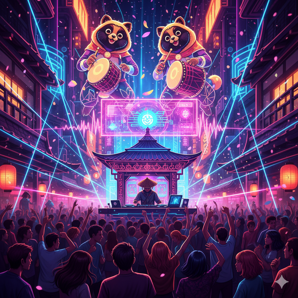 Intro: Jinta's "Beautiful Nature" rhythm, Ghibli house music, The "Shanshan Typhoon" from the Ghibli film "Pom Poko" evokes the image of this Asian city, Wind instruments such as chindon drums, clarinet, cornet, and baritone, EDM, Maintaining a festive, lilting atmosphere, the four-on-the-floor rhythm and groove unique to house music, Okinawan sanshin and Chinese erhu, Mixing traditional Japanese elements with musical elements from across Asia, Mid-tempo, 120-128 BPM (Beats Per Minute), Danceable walking bass line, Asian scales with synthesizer leads/plucks, Using samples of thick toms and congas, like those used in tribal house, layered as complex sounds over a four-on-the-floor kick