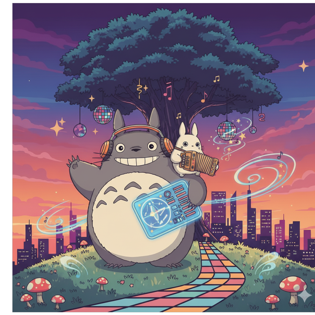 Uplifting melodic house, Inspired by the music of the Ghibli film "となりのトトロ, " House music that emphasizes "jinta rhythm, " A nostalgic, energetic march groove, Expression of "jinta": A 2/4 march rhythm is combined with house 4/4 beats, The kick and bass create a stable 4/4 groove, while brass and percussion add the syncopated "zun-cha-cha" rhythm characteristic of marches, BPM: Approximately 120-128, Kick drum: A stable 4/4 beat, Bassline: A warm analog synth bass, Hi-hat: 16th-note open and closed hi-hat, Brass: The most important element of jinta, Trumpet and trombone samples, as well as lo-fi synth brass, Accordion: Elements of nostalgia and European jinta (Balkan music, etc, ), Piano house music, Accordion: Adding elements of nostalgia and European Zinta (Balkan music, etc, ) to create a melancholic yet cheerful sound, Mallet instruments (xylophones and metallophones)