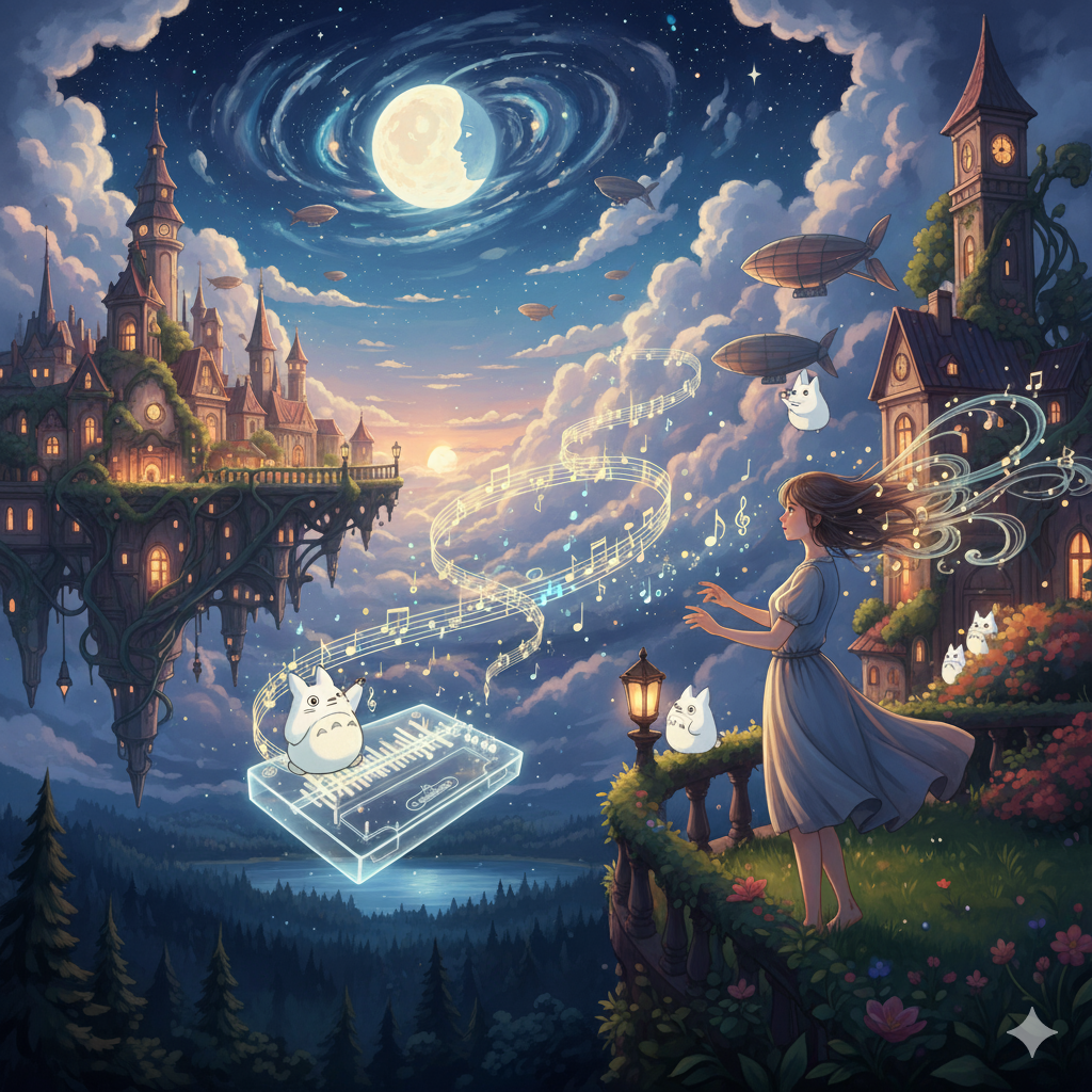 House music in the style of Ghibli films, with a heavy use of the theremin, Dreamy, nostalgic, floating, and romantic, Melodies that evoke nostalgia, A steady four-on-the-floor beat provides propulsion and groove, The role of the theremin: Used for the main melody line, obbligatos that create a mysterious atmosphere, and drones, The theremin's smooth pitch changes create a floating feeling like the movement of the sky and clouds seen in Ghibli films, The up-tempo yet comfortable chill-out feel creates a melody that combines beauty and a touch of melancholy, making it perfect for listening to on a late-night drive or under the stars, Progressive house, Theremin: Main melody, obbligatos, Synthesizer: Clear digital synth that delivers the peak of the song, Piano: Rhythmic chord cutting that supports the house groove, and gentle Ghibli-esque arpeggios, Synthesizer: Pads and bass, with a thick, round sub-bass that is typical of deep house, Drum machine, string instruments
