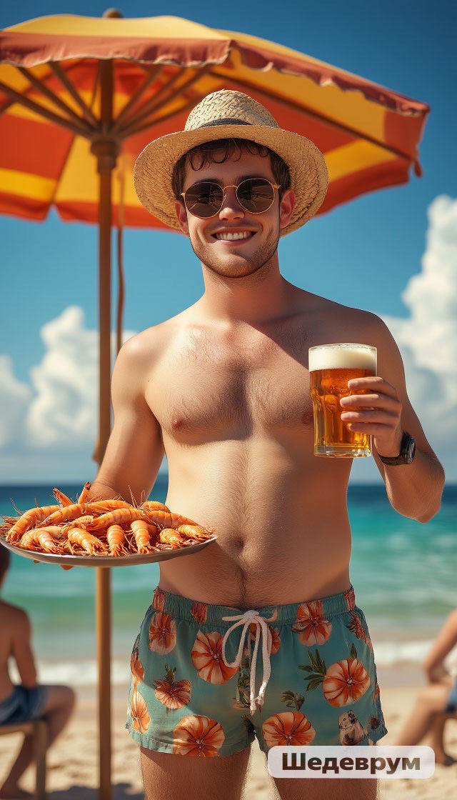 Upbeat humorous summer song with male vocal, playful and light, tempo around 100 BPM, Acoustic guitar, bass, drums, light percussion, brass accents for a fun holiday vibe, Use beach party atmosphere with reggae influence in Verse 2 (relaxed groove), then return to energetic playful pop-rock with hints of cabaret, Style: ironic chanson-pop mixed with beach rock, playful delivery, relaxed but with drive in choruses, Vocals should sound like a slightly tipsy storyteller, cheerful and mischievous, singing about beer, shrimp, and vacation life, Add backing “la-la” or “oh-oh” vocals in choruses for party feel, Outro should repeat chorus in a playful drunk style fading out, Atmosphere: fun, ironic, holiday all-inclusive mood with Caribbean summer colors, Vocal reggae