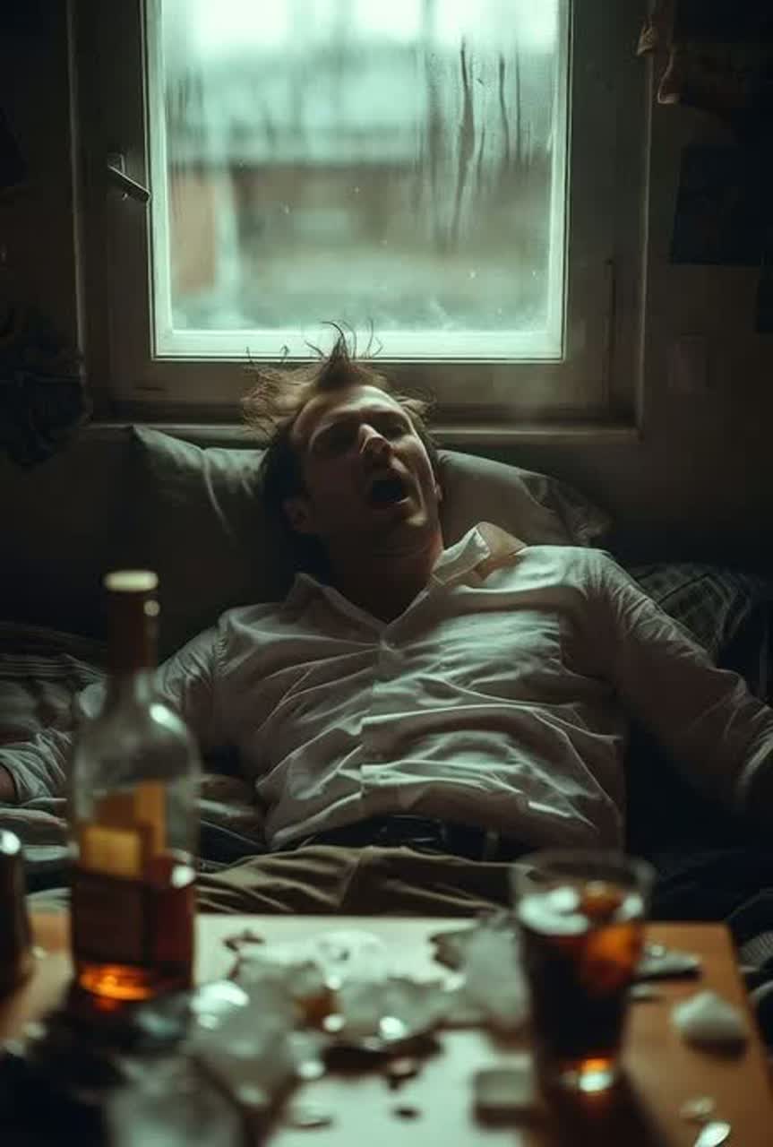 Vocal Style: Male baritone voice, clear but slightly raspy and emotional, close-mic'd, with a sense of intimacy and sorrow, On the word "Delirium" use a subtle echo/distortion effect, Key Elements: