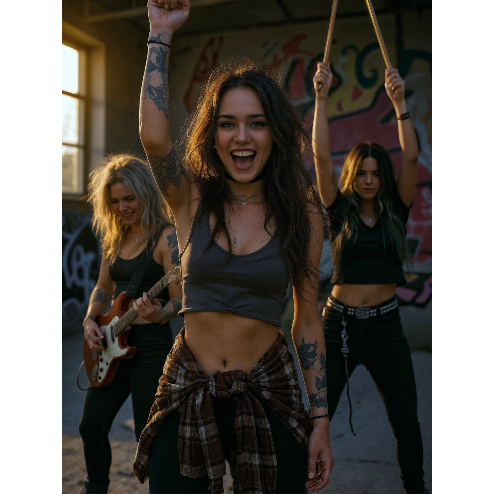 Sultry, gritty female lead vocals with raspy emotional delivery with Female Vocal group Backup, Riot Girl, Ska, 90s-inspired alt-rock with grunge-pop flavor, electric guitars, walking melodic basslines, punchy drums, Starts slow and introspective, builds to powerful anthemic choruses, Upbeat, Happy, Emotional, edgy, mid-tempo with attitude