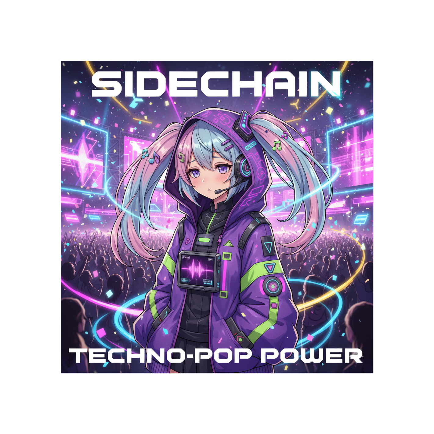 [kawaii Vocaloid] punchy techno-pop, sidechain compression, vibrant leads, high-energy chorus, festival-ready sound