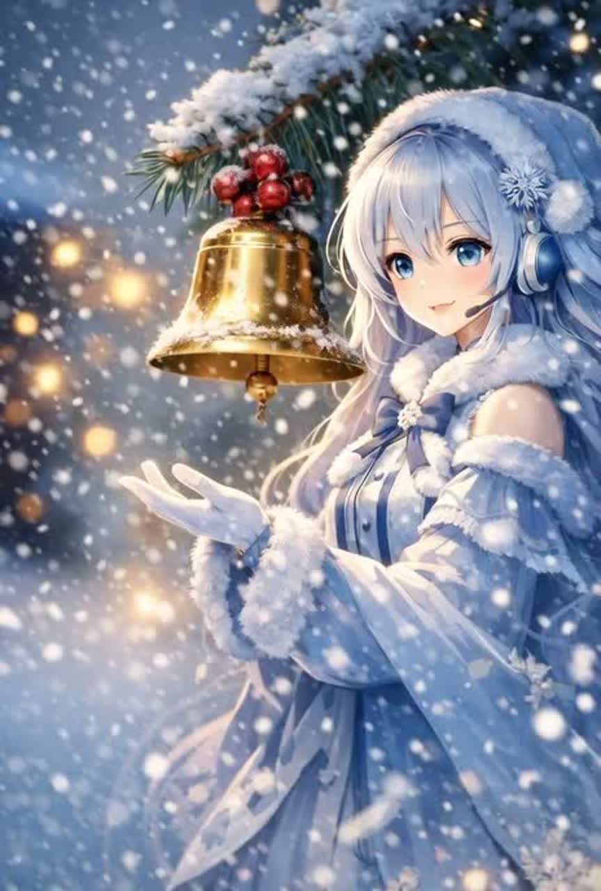 Kawaii Vocaloid-style with intentional micro pitch drift, subtle off-key charm, synthetic formants, bright nasal tone, digital vibrato instability, Christmas Pop EDM, Instrumental only, Bell-driven hook concept, Catchy festive intro, Bright pop synths, Modern EDM structure, Danceable four-on-the-floor groove, Warm and cheerful Christmas mood, Pop-friendly buildup sections, Clear verse to drop progression, False drop tension, Delayed payoff climax, High-energy EDM bass drop in final chorus, Catchy sleigh bell accents used sparingly, No constant bells, No vocals, No choir, No lyrics, Radio-friendly sound design, Streaming-oriented arrangement, Uplifting night-time celebration vibe, Neon city Christmas imagery, Punchy low end, Clean wide stereo mix, Instant replay value, Feel-good holiday energy