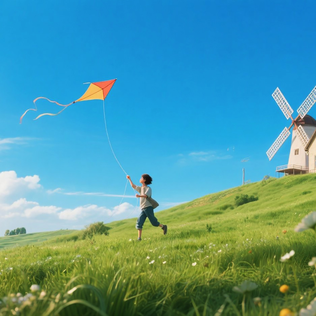 The sound tracks should be at least four minutes long, Uplifting New Age ambient instrumental inspired by the feeling of flying with the wind, Light, breezy tempo with soft piano melodies, flowing xiao flute lines, and rhythmic shamisen plucks, Includes airy ambient textures and gentle wind sound effects, Mood is liberating, joyful, and light-hearted — like dancing through open skies, A musical expression of freedom and movement, Intro: Wind sounds and a light synth pad usher in the space, Verse: A flute-like melody flows, while a shamisen creates a dynamic backing rhythm, Middle Section: Piano and high-pitched strings elevate the mood, Bridge: A brief silence, followed by a resurgence, Outro: A gentle tapping rhythm and a gentle breeze close the song, leaving an airy lingering effect