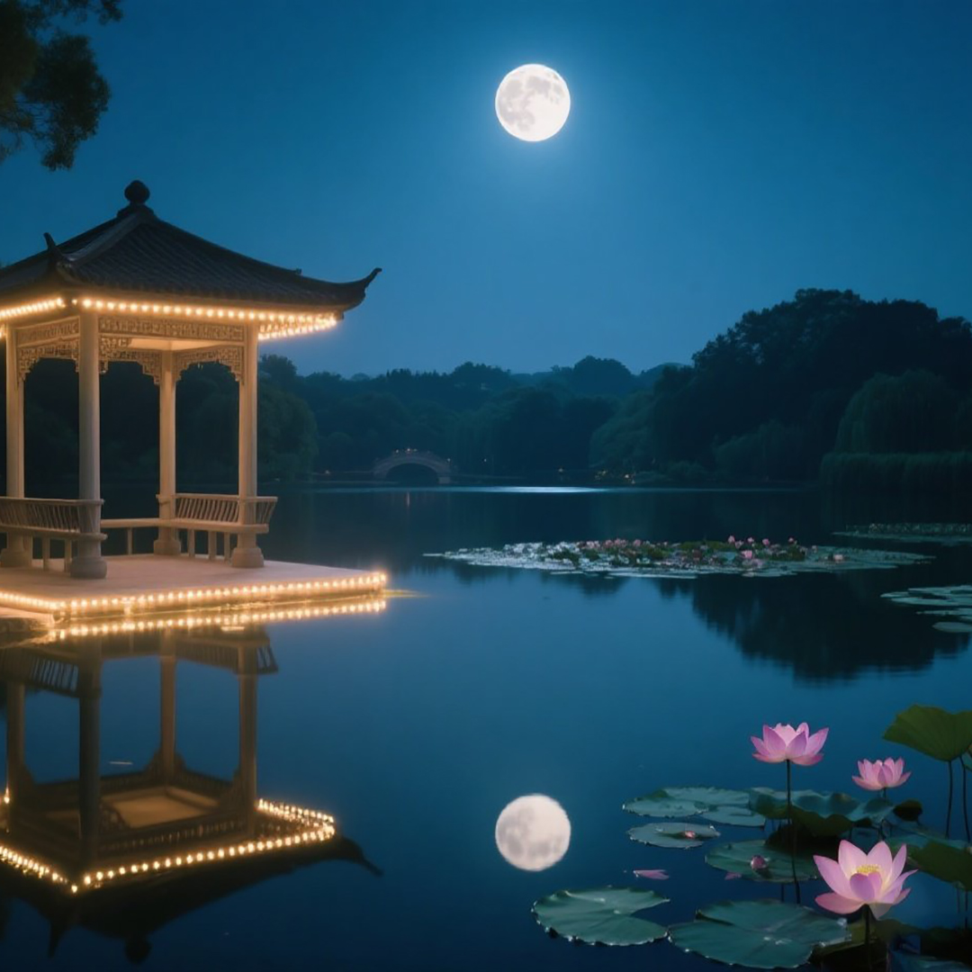 The sound tracks should be at least four minutes long, Ethereal ambient New Age instrumental inspired by the gentle glow of a full moon at night, Features soft, sparse piano notes, atmospheric pads, light string harmonies, and traditional instruments like the Japanese shamisen (subtle plucked accents) and Chinese xiao flute (melodic lead), Slow tempo with a calm, introspective mood, Includes faint wind sounds and distant night ambiance, Poetic, emotional, and serene, Intro: Fade into the ambiance of a moonlit night (wind and insects)