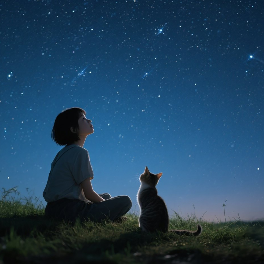 The sound tracks should be at least four minutes long, Deep ambient instrumental inspired by a quiet, starlit night sky, Features spacious ambient textures, soft piano notes, slow cello harmonies, and haunting xiao flute melodies, Guzheng plucks lightly mimic the twinkling of stars, Includes subtle space-like reverb and distant nighttime nature sounds, Slow tempo, introspective, mysterious, and cosmic in feeling, Intro: A long pad creates a cosmic feel, opening with subtle insect chirps and wind, Main Theme: A flute melody introduces the main melody, punctuated by a bass piano and slow guzheng melody, Bridge: The space gradually thins out, leaving only scattered sounds and echoes, Climax (less intense): Layers deepen, reminiscent of the movement of stars and the resonance of the soul, Outro: The notes fade away, the soundstag