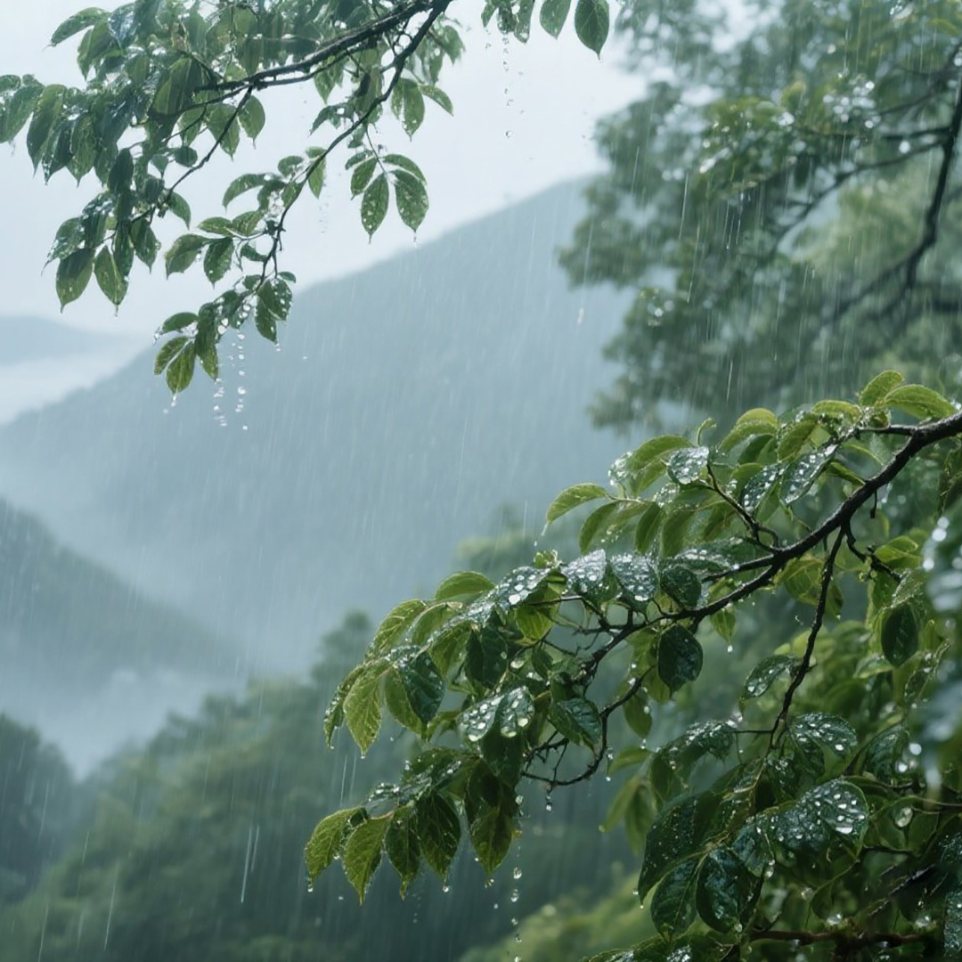 The sound tracks should be at least four minutes long, Gentle ambient instrumental inspired by the beauty of falling rain, Features soft ambient piano melodies, delicate guzheng plucks mimicking raindrops, and flowing xiao flute lines like wind through rain, Includes subtle natural rain sound effects and slow, calming pads, Emotional, healing, and deeply soothing — like watching rain from a quiet room, Tempo slow, mood reflective and peaceful, Intro: Opens with the sound of drizzling rain, followed by a gentle pad, spreading like mist, Main Section: Piano introduces a simple melody, embellished by a guzheng, and a whistling breeze, Bridge: Rain and piano bass solo, adding distant thunder or a sense of flowing air, Outro: The melody gradually simplifies, leaving only the sound of drizzling rain and echoes