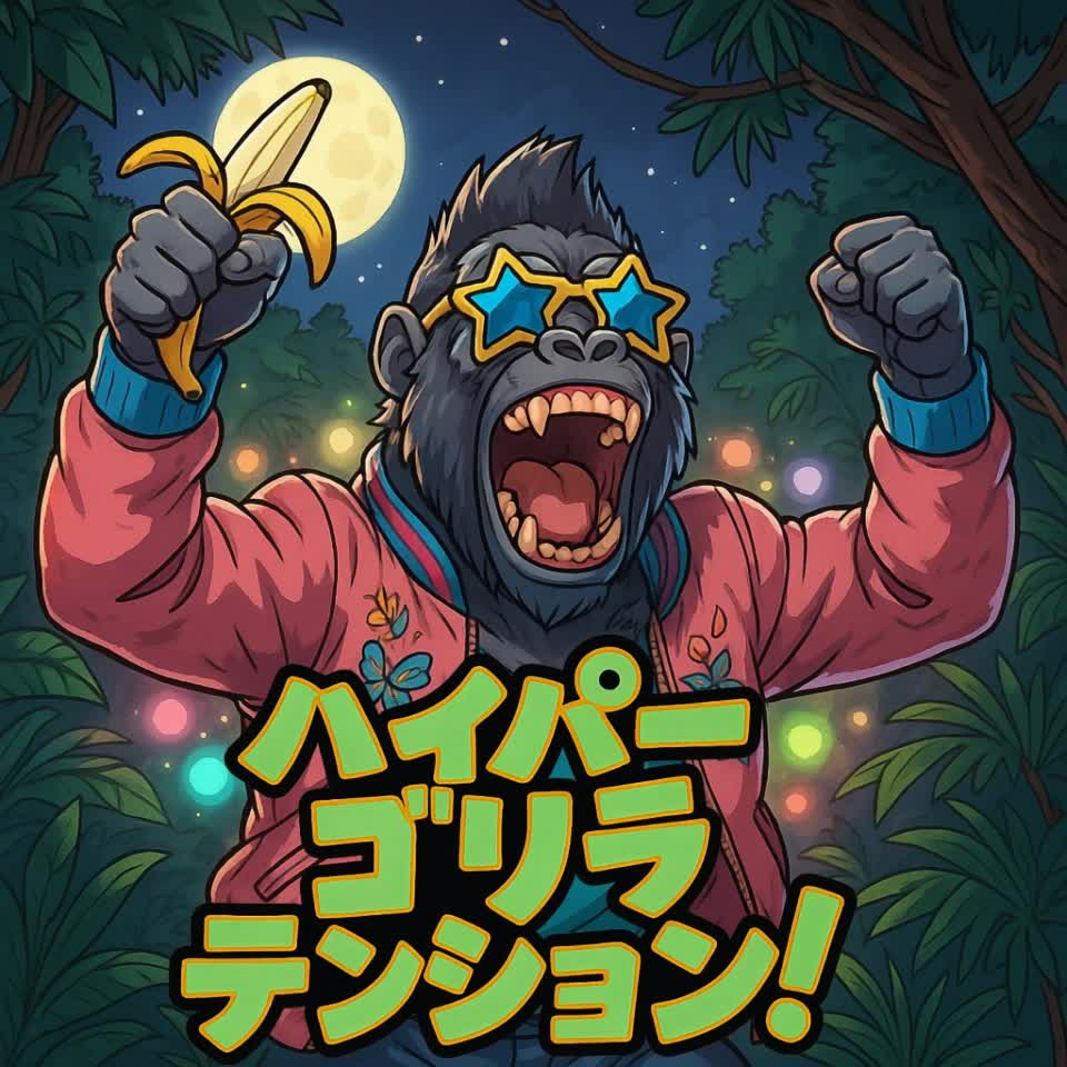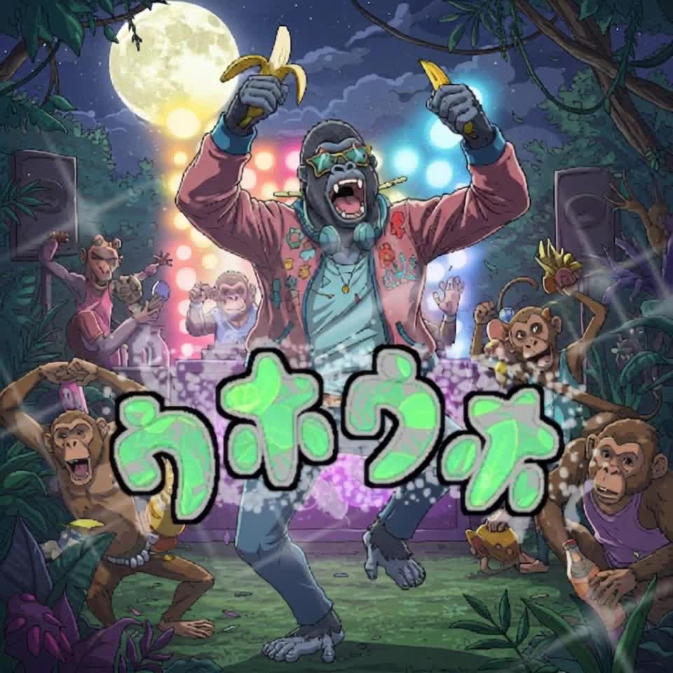 jungle, tribal percussion, carnival party, world music, wild energy, male vocal, rap section, call and response, deep drums, conga, bongo, djembe, animal sounds, festival atmosphere, energetic chorus, chant vocals, danceable groove, fun & powerful, gorilla rap