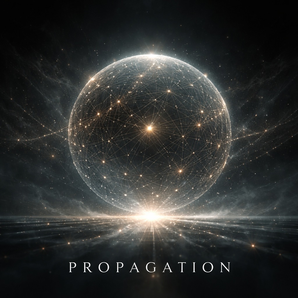 Create a 4 to 4, 5 minute ambient, neo-classical, and cinematic meditation track titled 'Propagation, ' The song is a patient, reverent observation of truth emerging across a decentralized network, The mood is spacious, philosophical, profound, and calming, MUSICAL VIBE: Deep, resonant, slow-playing piano providing the core melody, Warm, slowly evolving synth pads form a vast bed of sound, Subtle, textural sound design: soft crystalline pings, distant echoes, and a gentle, low-frequency infrastructure hum, The tempo is extremely slow and deliberate, creating immense space between notes and phrases, VOCAL STYLE: Male, Calm, clear, reverent spoken word, The delivery is like a meditation guide or a philosopher observing a fundamental law of nature—completely devoid of rush or drama, The final chorus should be delivered as separate, weighted concepts, INSTRUMENTS: Piano, Synthesizer (Warm Pads, Textural Drones), Sound Design (Crystalline Pings, Subtle Echoes, Infrastructure Hum)