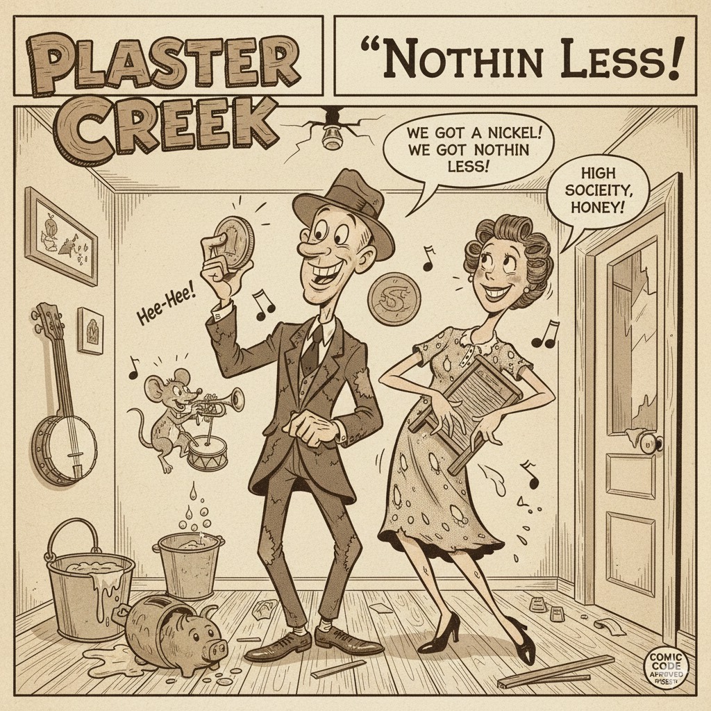 lively, vintage jazz-swing song with a playful, retro vibe, Use brass instruments, clarinet, and a bouncy rhythm, Incorporate catchy, quirky lyrics with a brass-heavy, upbeat style, Evoke 1920s-1940s jazz, with swing feel and danceable energy, Male and female vocals (old 40's vibe) rap, jazz, laugh track, cabaret, soul, record scratches, 1920’s jazz, funkadelic cartoon soul x lo-fi cabaret rap, theatrical horns, lo-fi, playful, hip-hop, fingers snapping Casio MT 40 for its synth fuzz effect