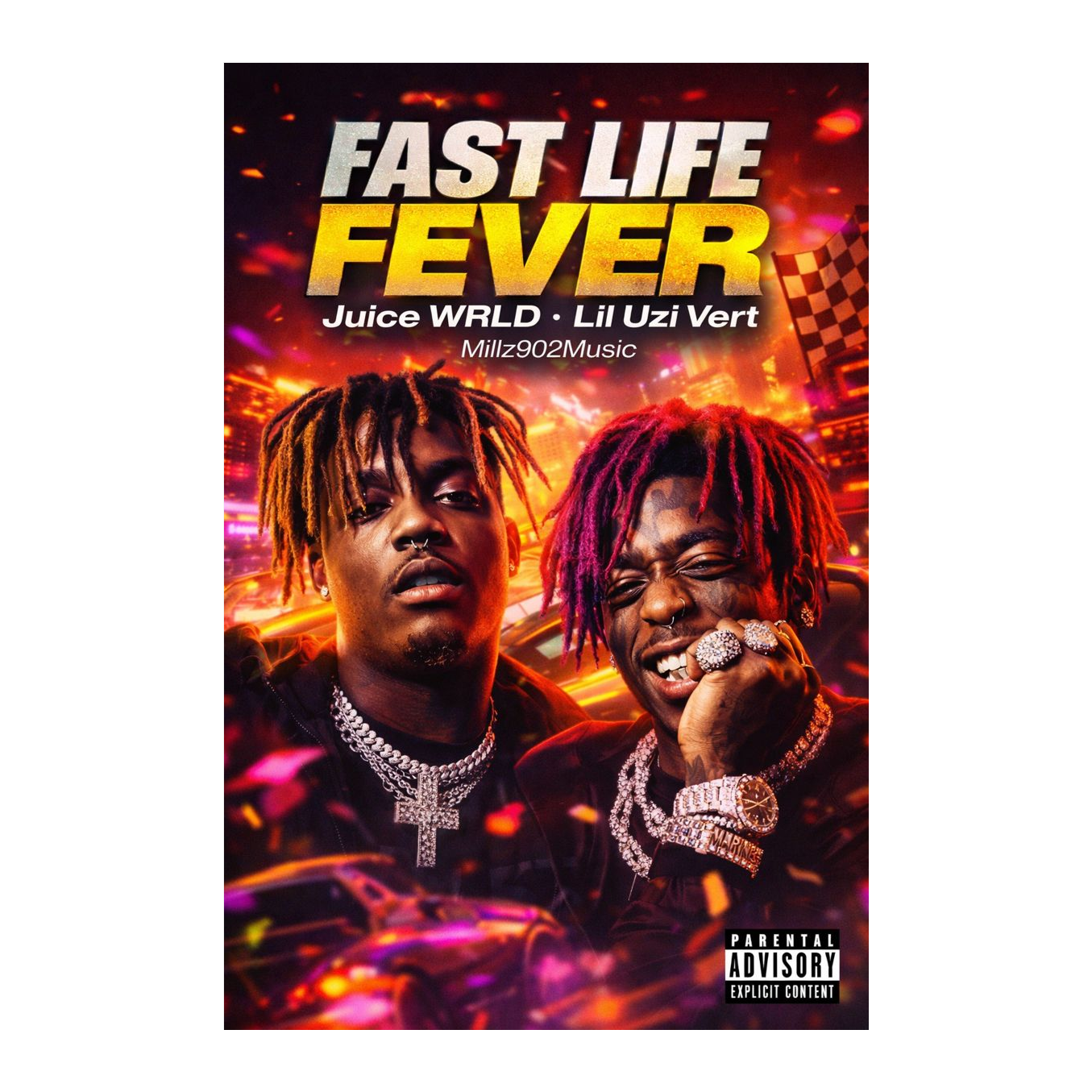 Fast melodic trap rap with JuiceWRLD style vocal delivery and a Lil UziVert feature section, Bouncy upbeat trap beat with Asian inspired pluck melodies pentatonic synths hard kick and snare heavy 808s rolling hi hats, High energy mix of singing and rapping catchy hooks fast cadence confident chaotic vibe, Explicit language playful flex energy club ready not sad not slow, No piano no acoustic no RnB no emo, ‑piano, ‑acoustic, ‑emo, ‑rnb, ‑slow, ‑lofi