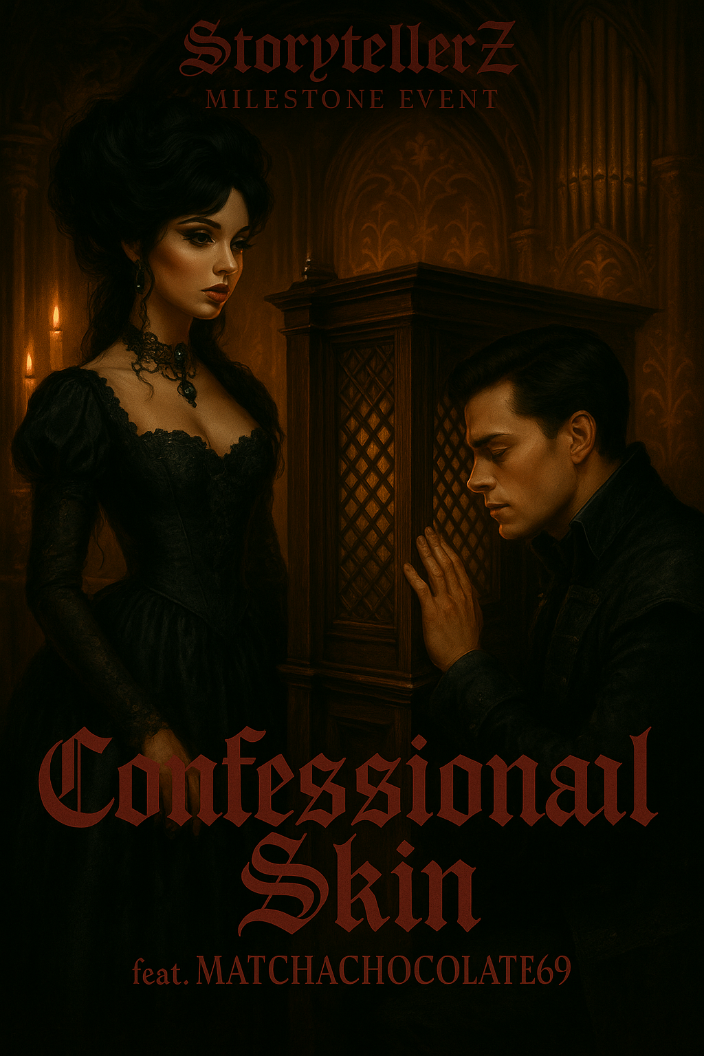 An opulent and decadent fusion of Gothic Trap Opera and cinematic Baroque Pop, with a dark, sensual, and theatrical atmosphere, The production creates a vast, sacred space by blending a haunting cathedral pipe organ and ghostly Gregorian choirs with the raw, physical power of a deep, distorted 808 sub-bass and crisp, syncopated trap hi-hats, The arrangement is a dynamic journey, with verses built on whispered intimacy and shimmering darkwave synth layers, swelling into a dramatic, romantic pre-chorus with soaring orchestral strings, The chorus explodes into a lush, powerful trap rhythm that feels both sacred and profane, The lead vocal is a whispered, sensual, and breathy female delivery that feels both seductive and dangerous, like a succubus in a confessional, The overall mood is a theatrical and atmospheric dark romance, balancing mystique, desire, and raw power, This is a masterpiece
